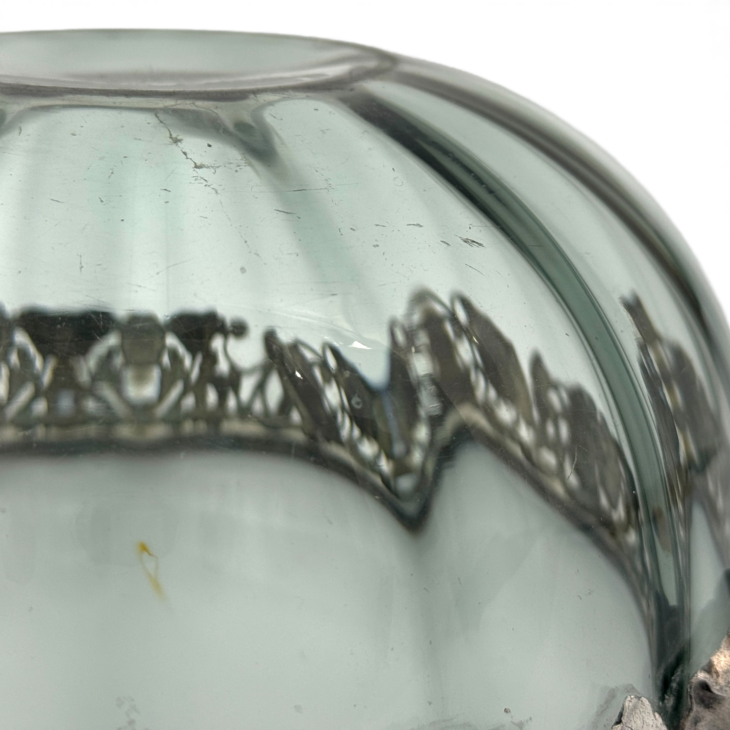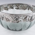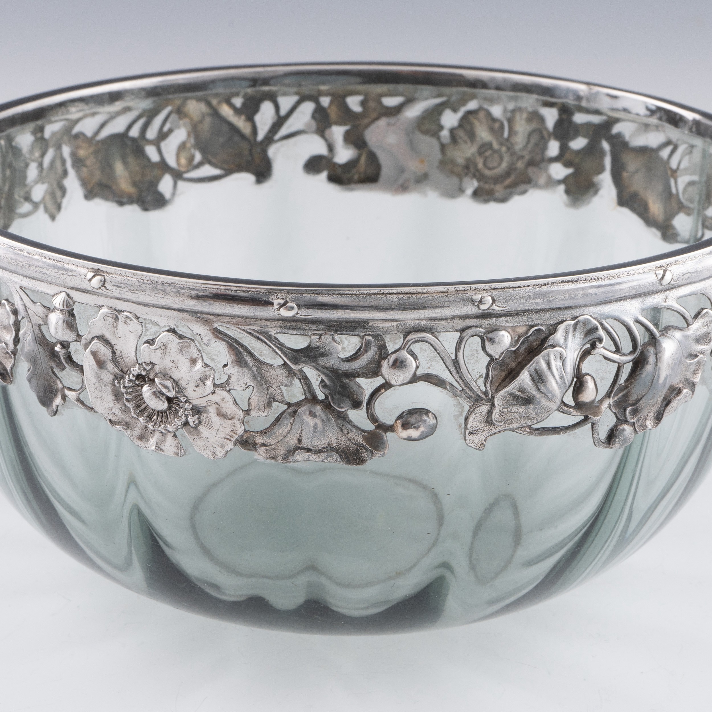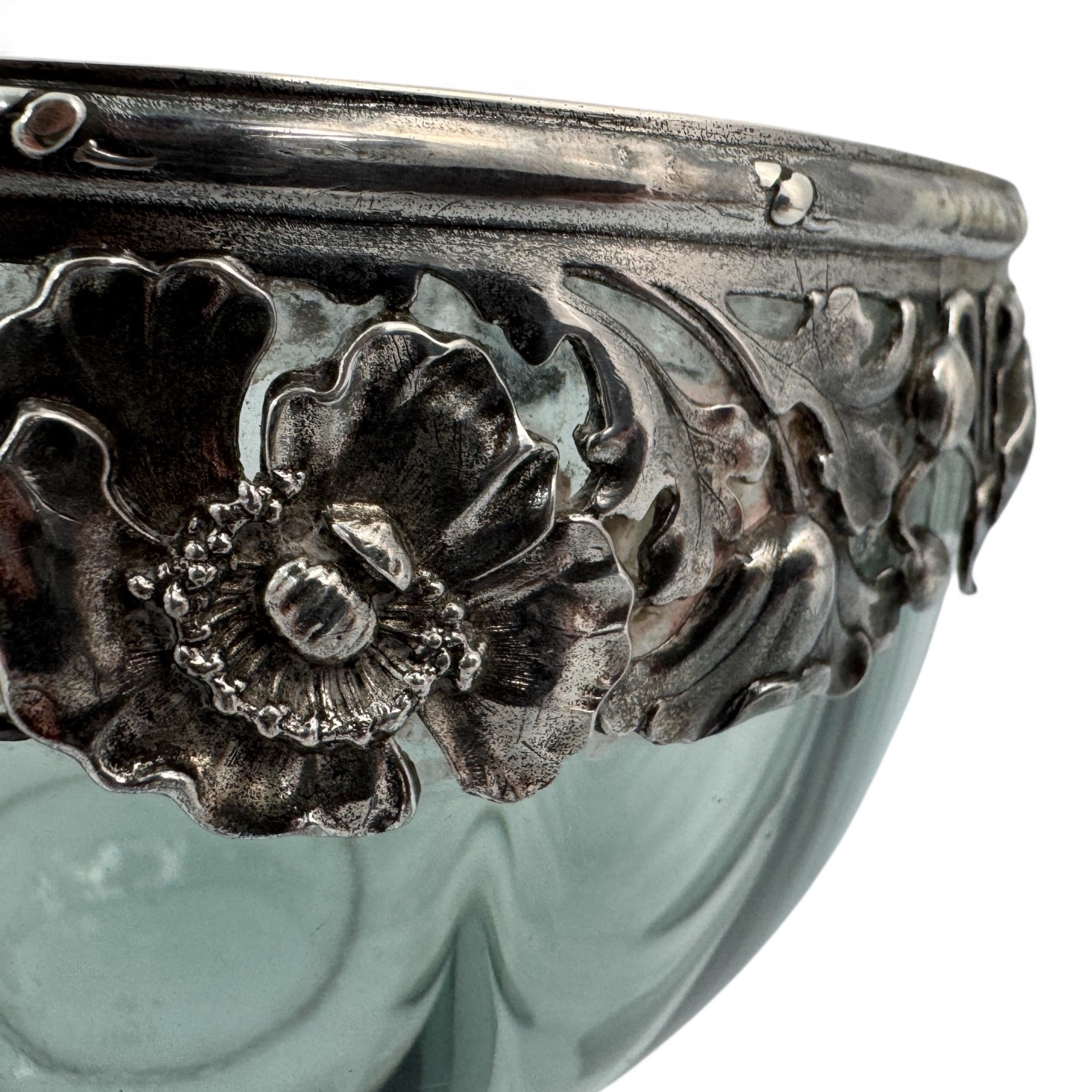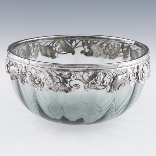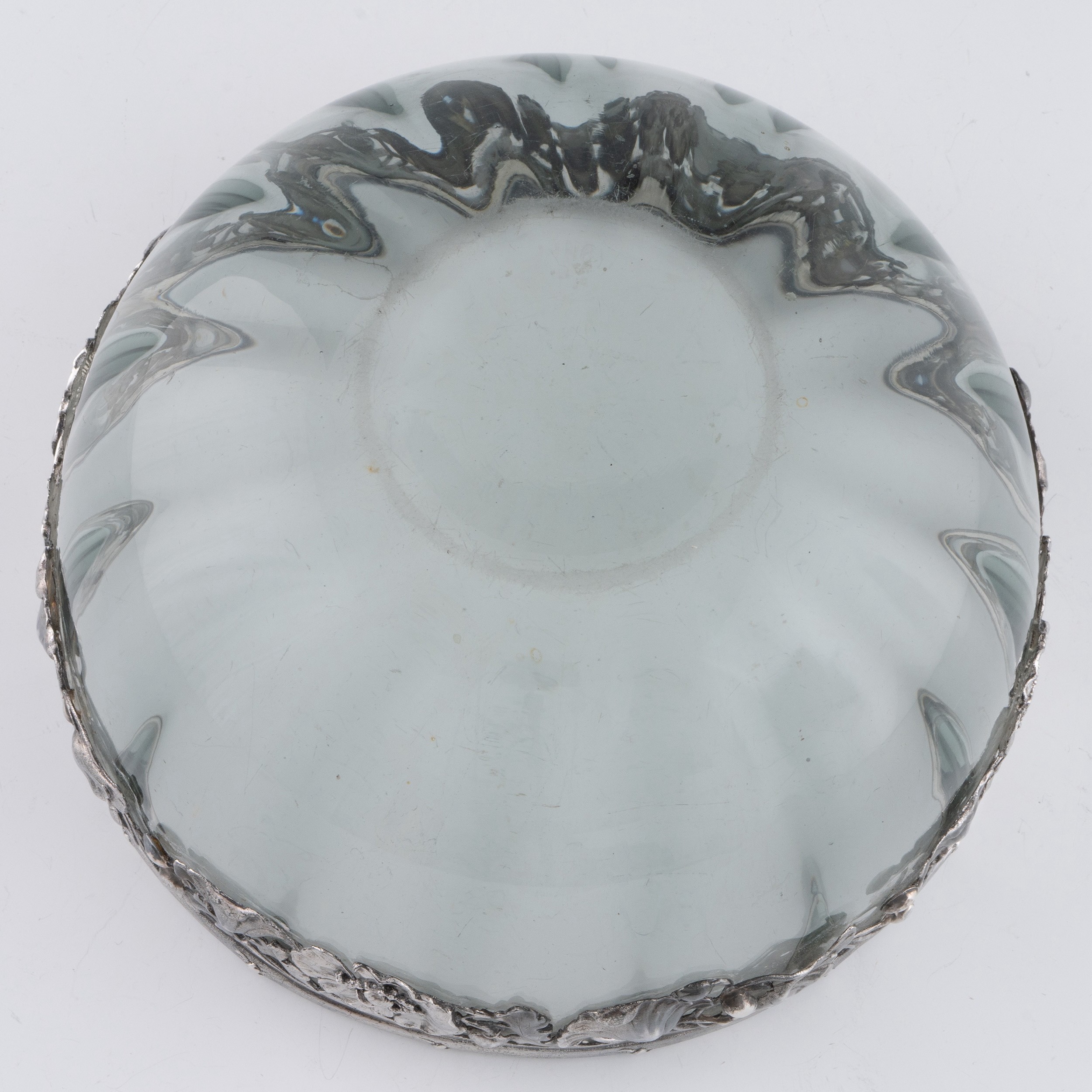 A 1920s French Daum Nancy glass bowl with silver mounts, with internally moulded blue grey glass and with applied silver rim modelled as flowers, berries and leaves, with Daum Nancy stencil mark on the underside, 9.1cm height, 18cm diameter, 540g.