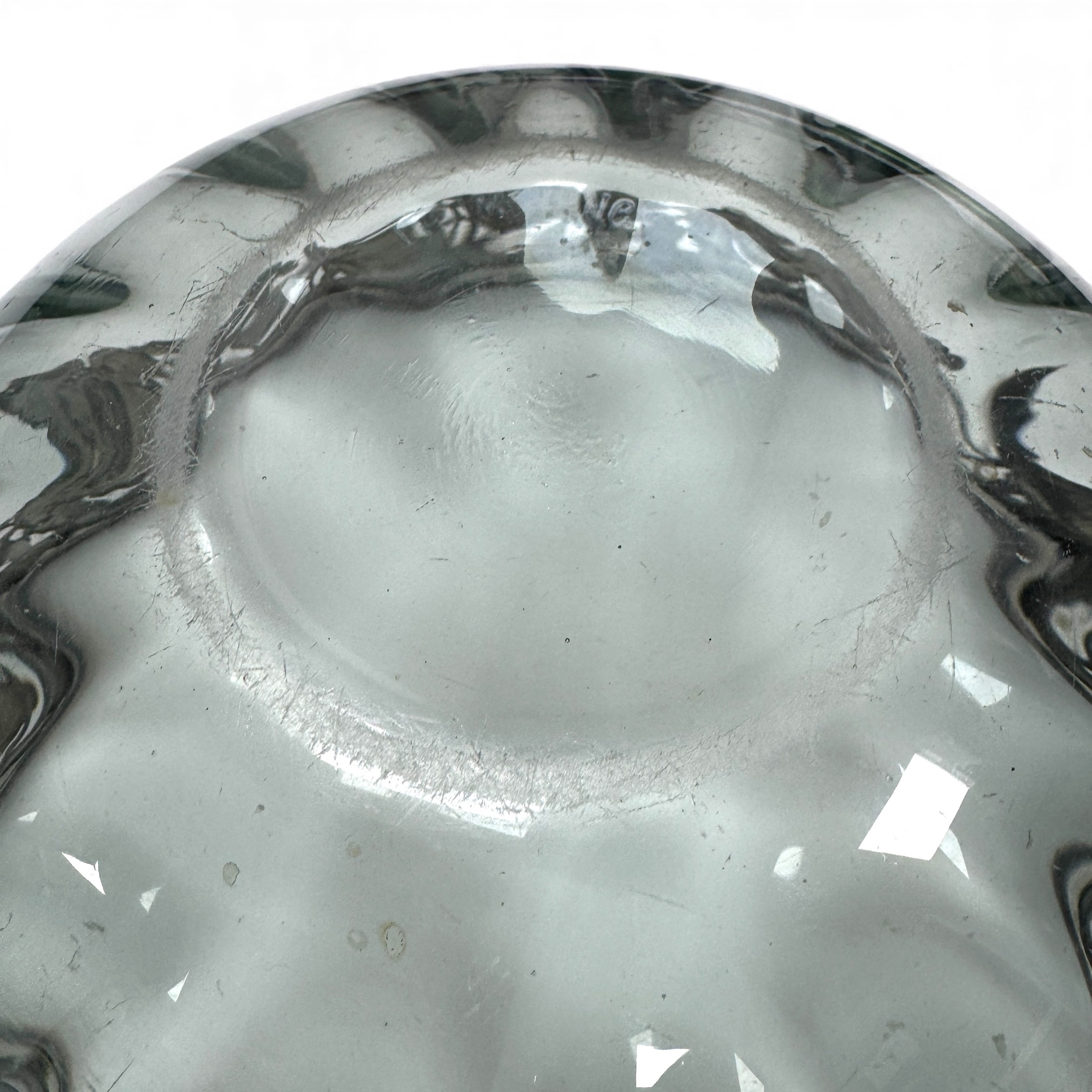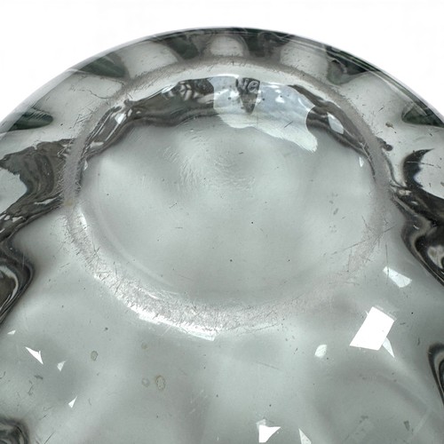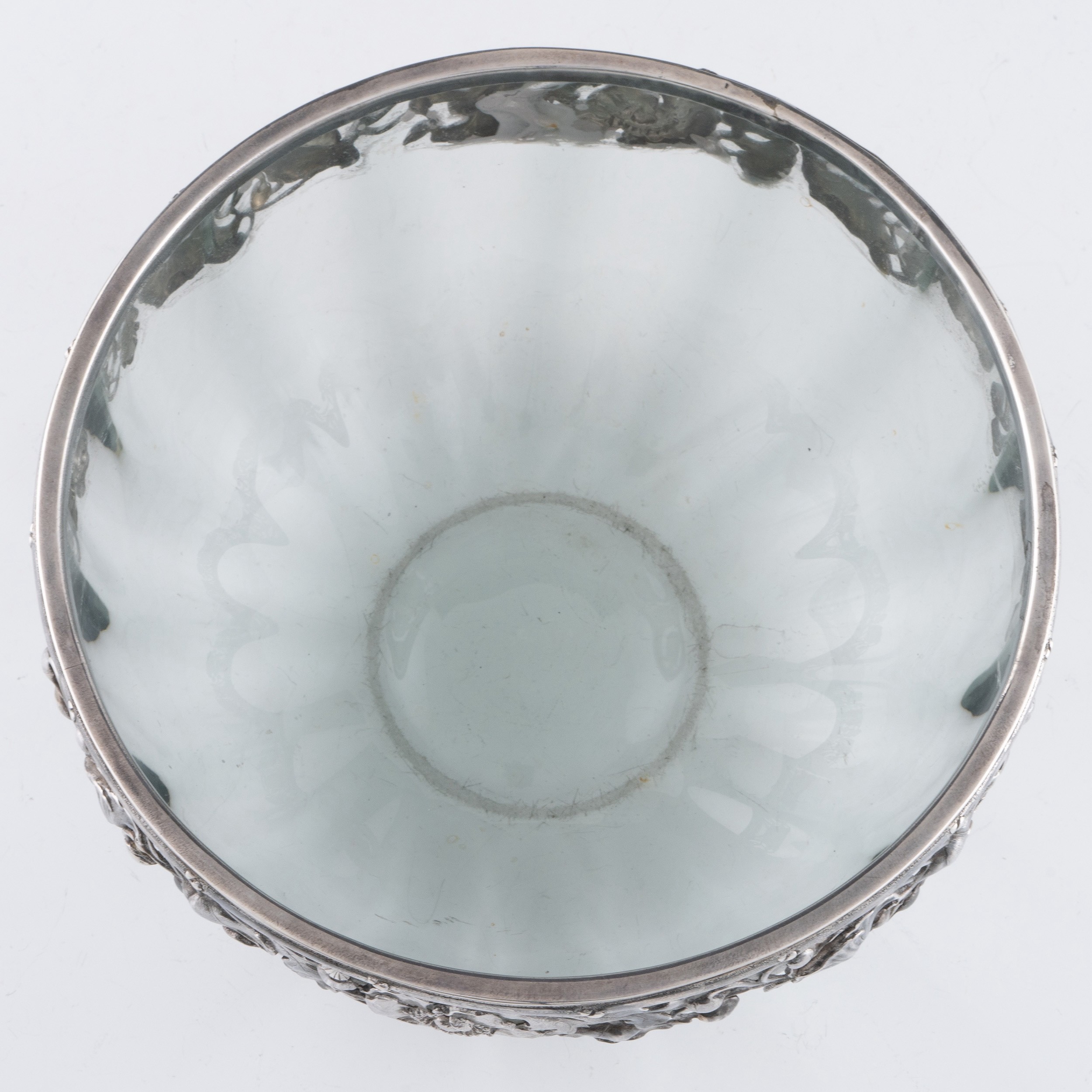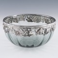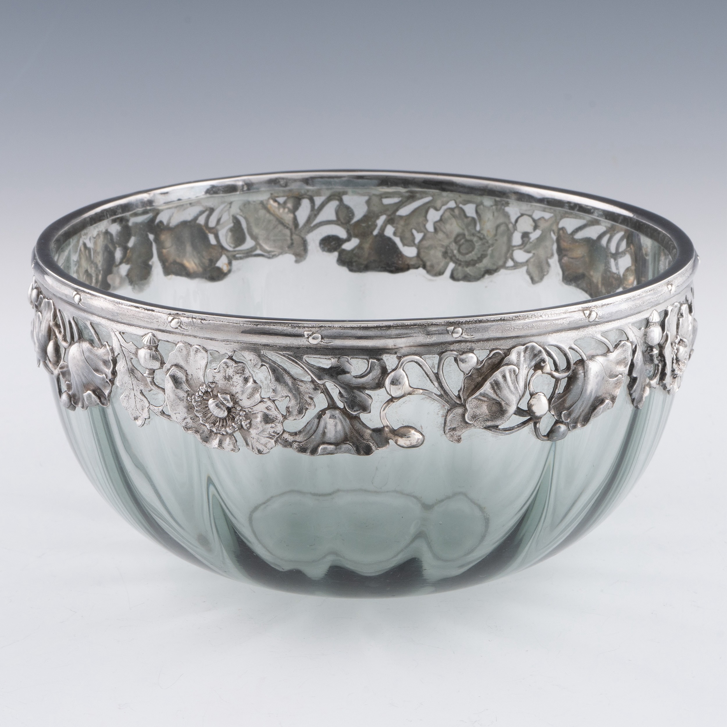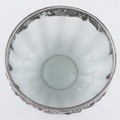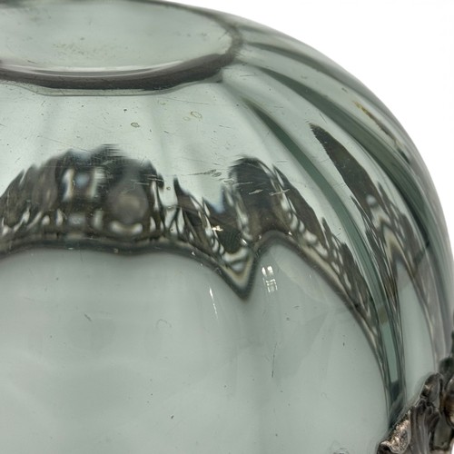 A 1920s French Daum Nancy glass bowl with silver mounts, with internally moulded blue grey glass and with applied silver rim modelled as flowers, berries and leaves, with Daum Nancy stencil mark on the underside, 9.1cm height, 18cm diameter, 540g.