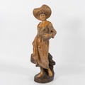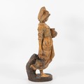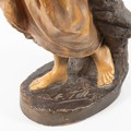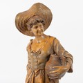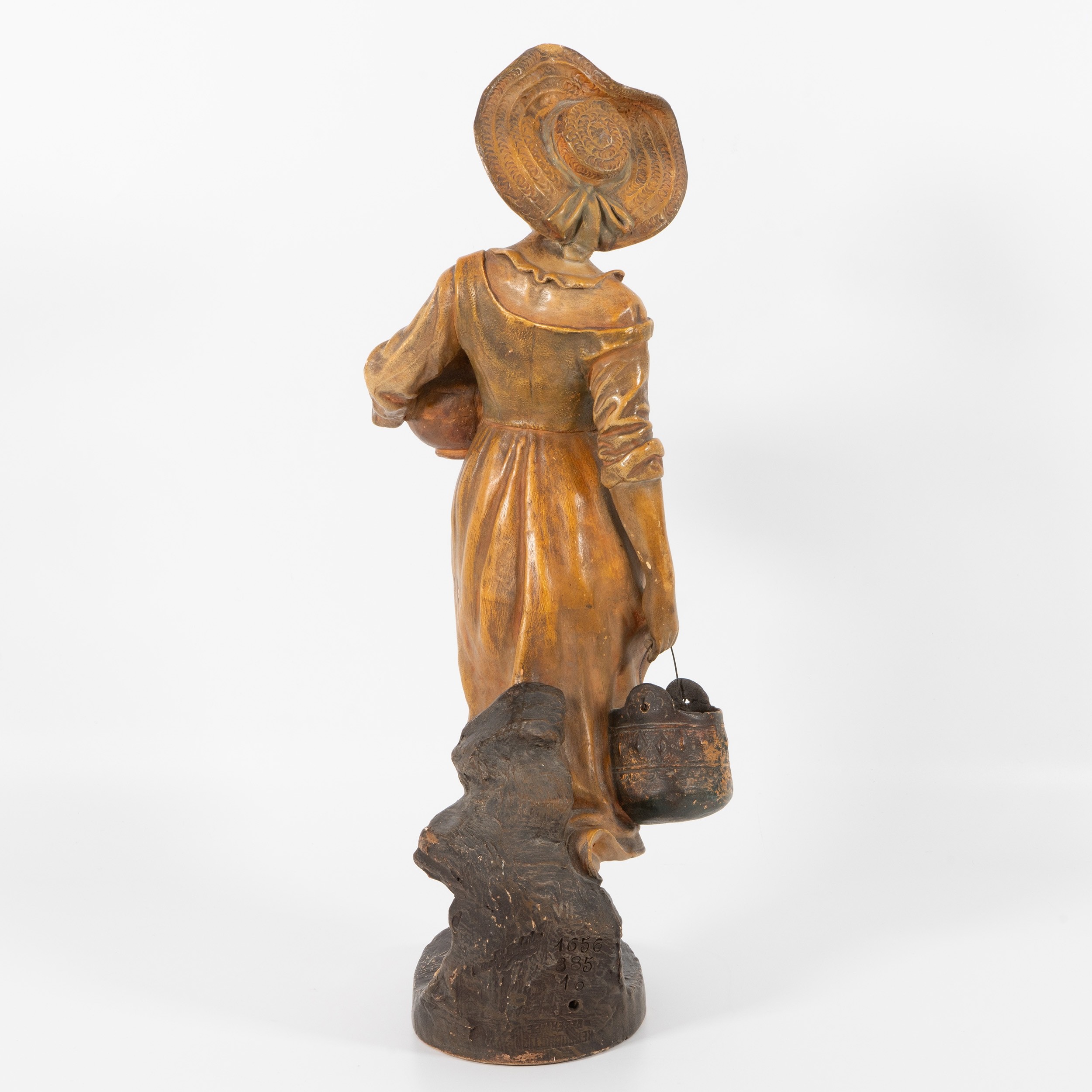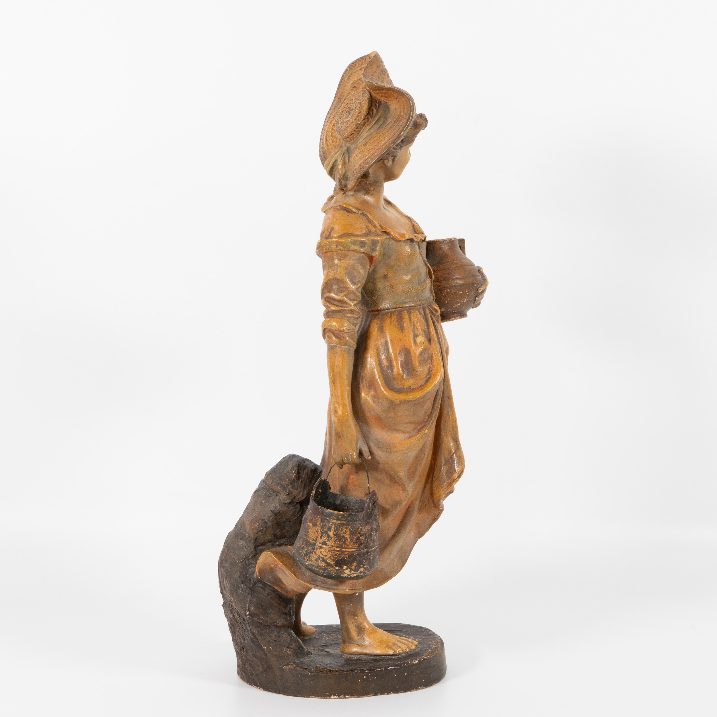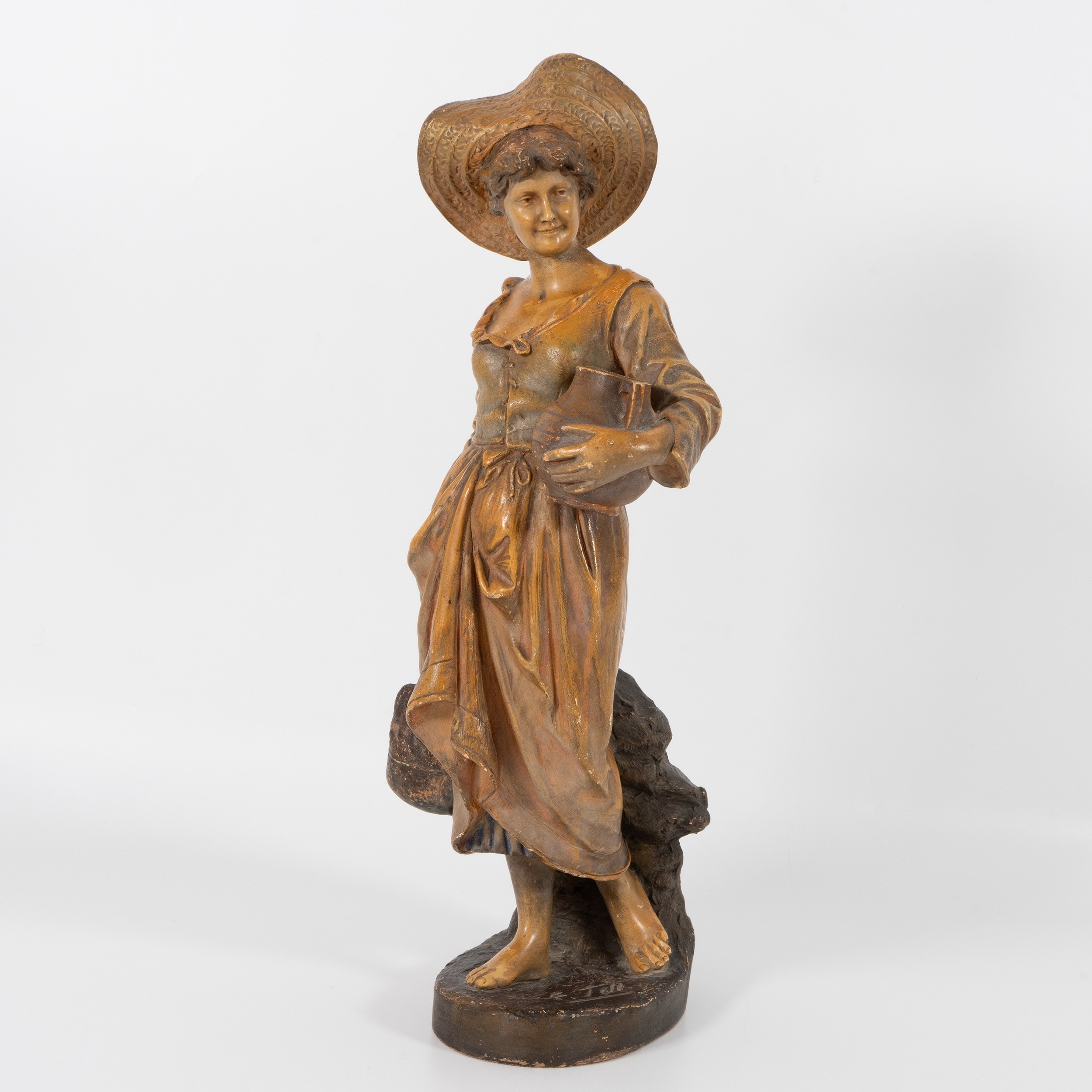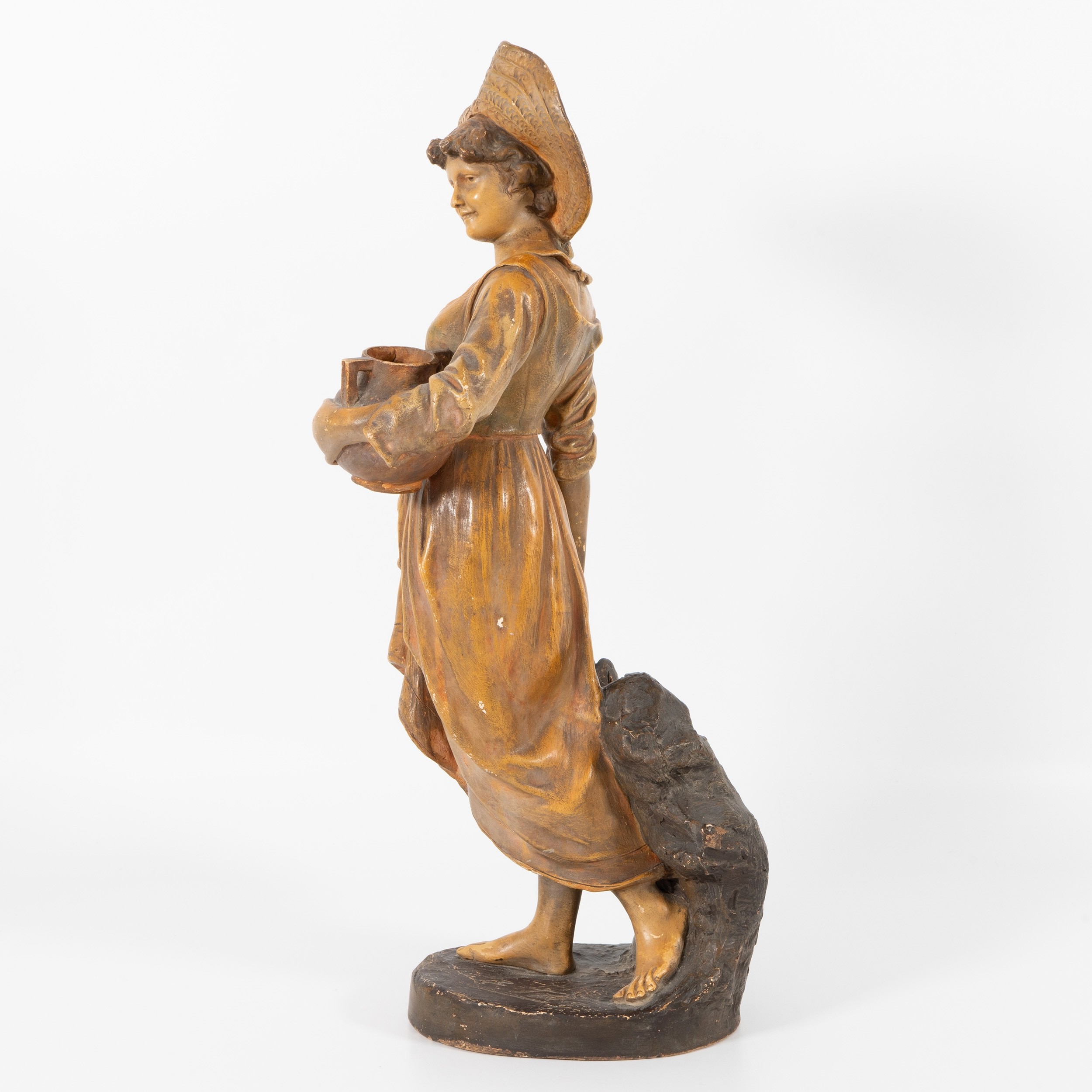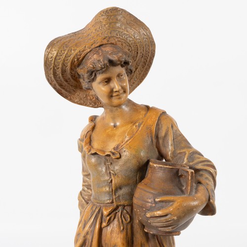 An Austrian Art Nouveau Goldscheider 'Caprieserin' (Girl of Capri) painted terracotta figure by E. Tell, c.1898, modelled as a young lady with wide brimmed hat carrying a buck and amphora-type vessel, 44.5cm tall, 17cm at widest. (LDC11800)