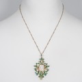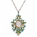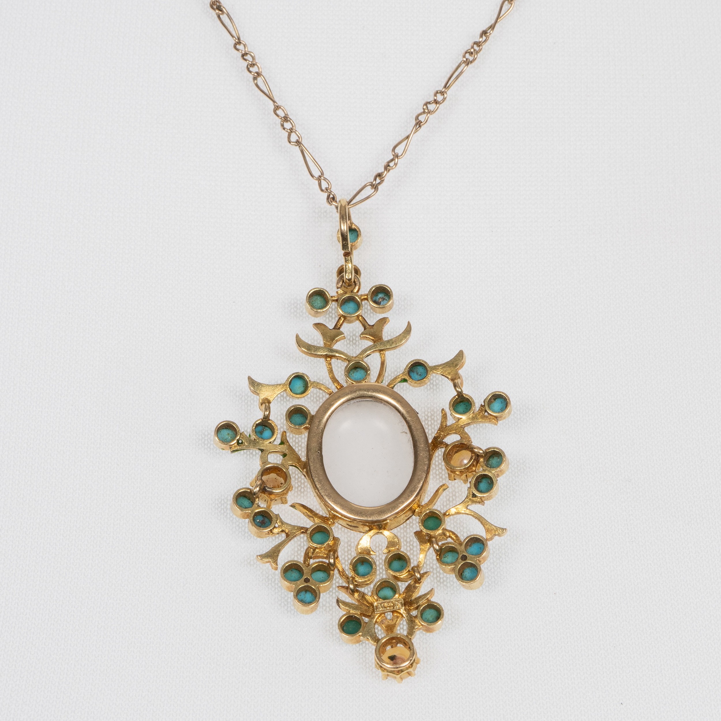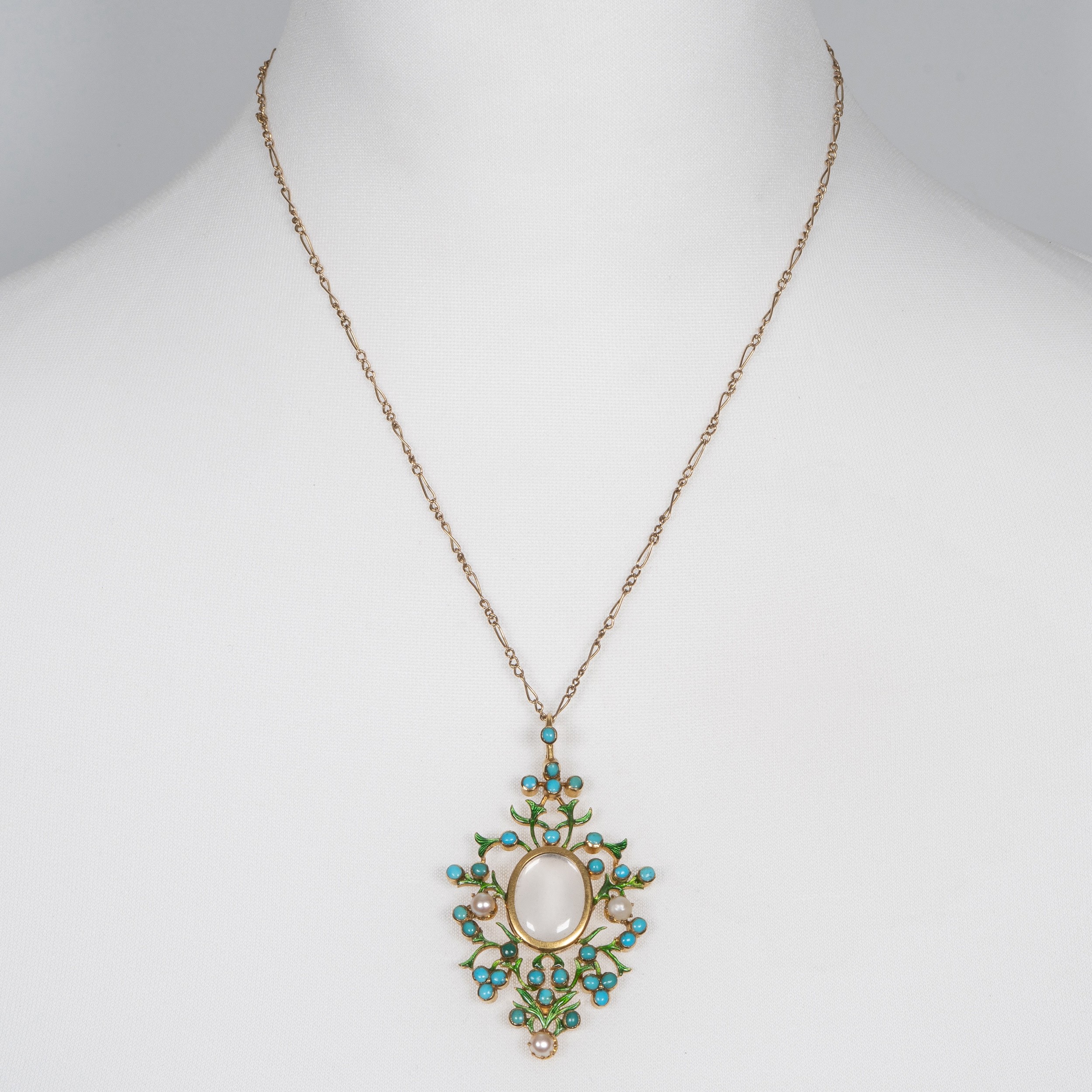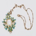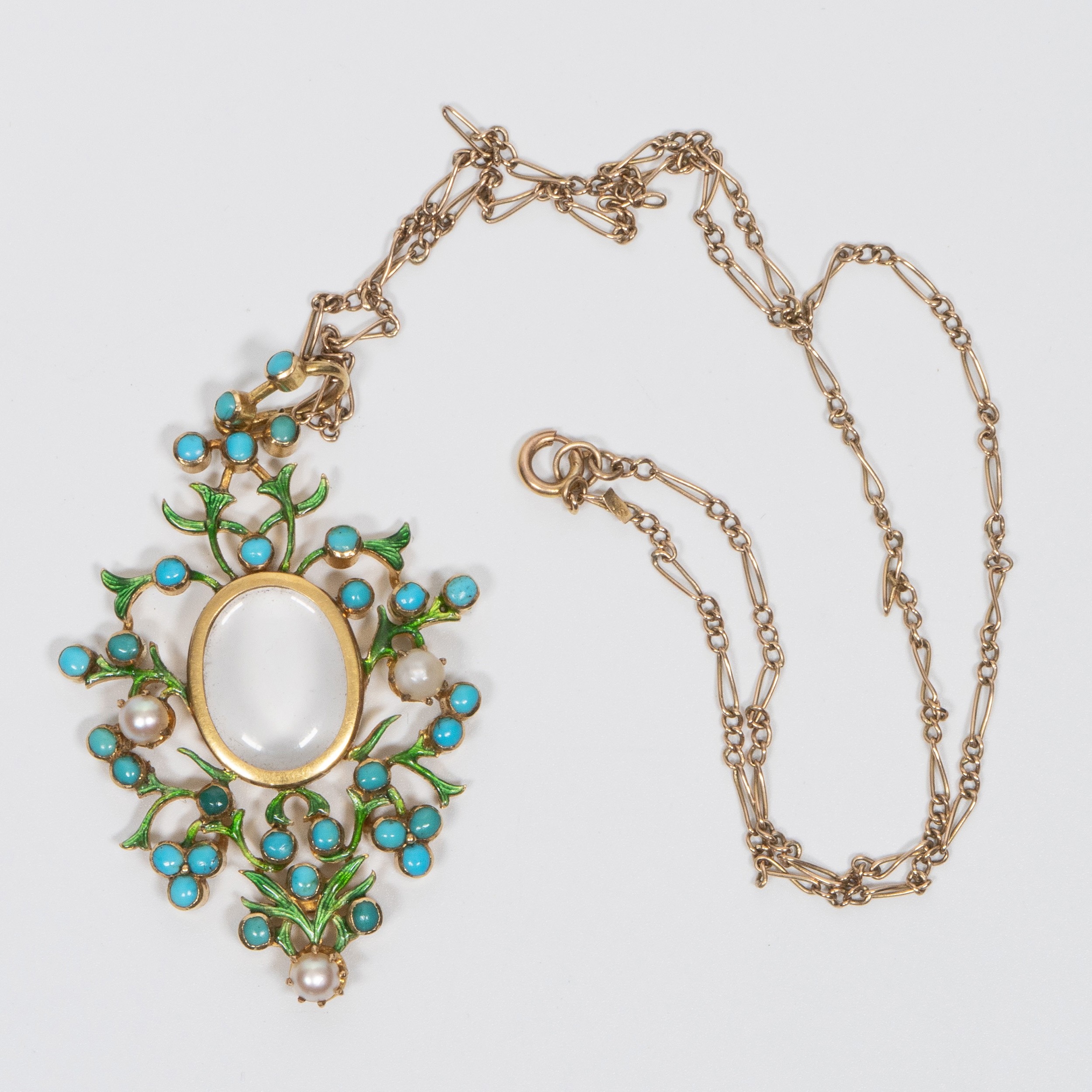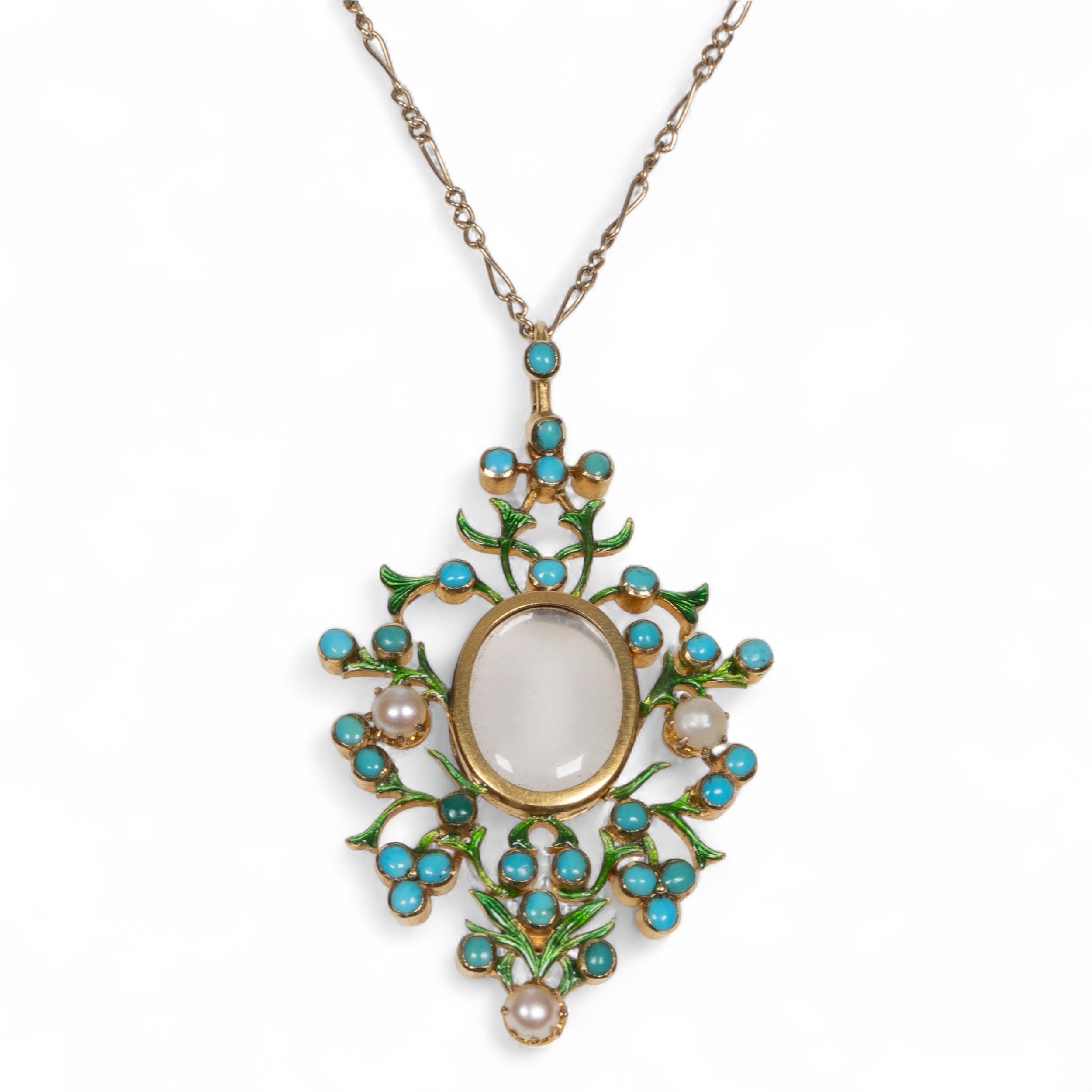 An Arts & Crafts Charlotte Newman yellow metal pendant/locket, openwork gold design decorated with enamelled stems and turquoise cabochons, with three natural pearls surrounding a central oval vacant locket which opens at the front, tests as 9ct gold, the reverse marked 'M RS N' for Mrs Newman, together with an associated yellow metal chain marked '9CT', 40cm total chain length, 6cm pendant, 3.5cm width, 17g total weight. (LDC15934)