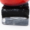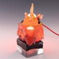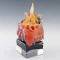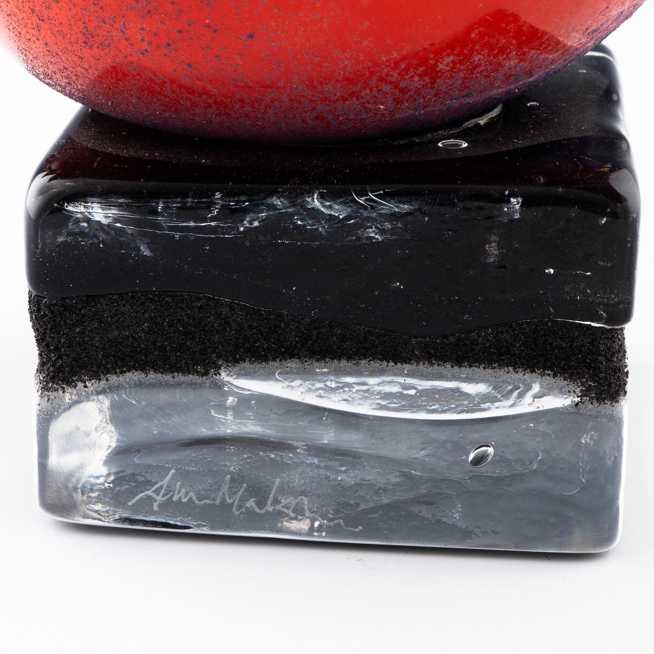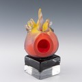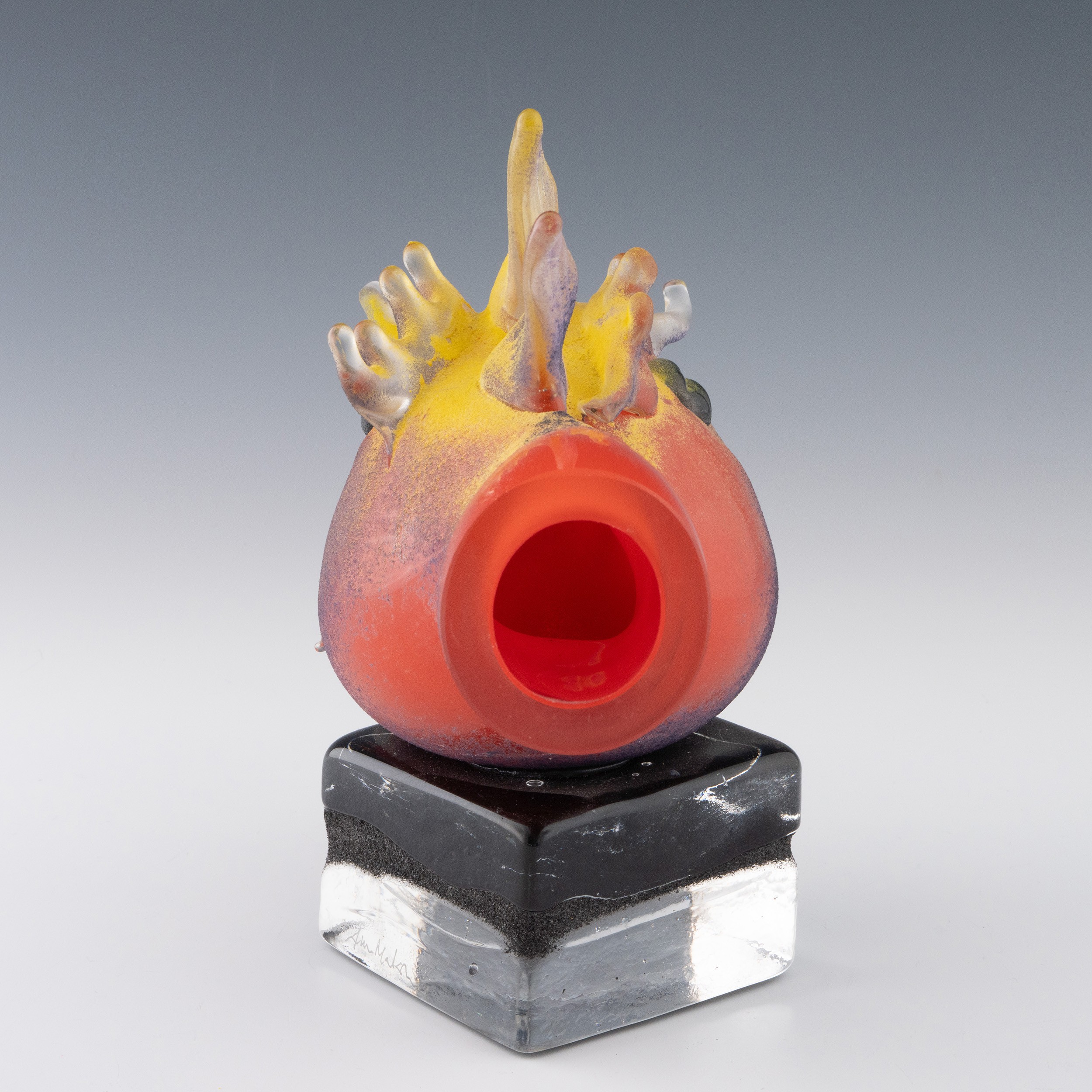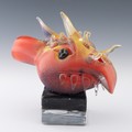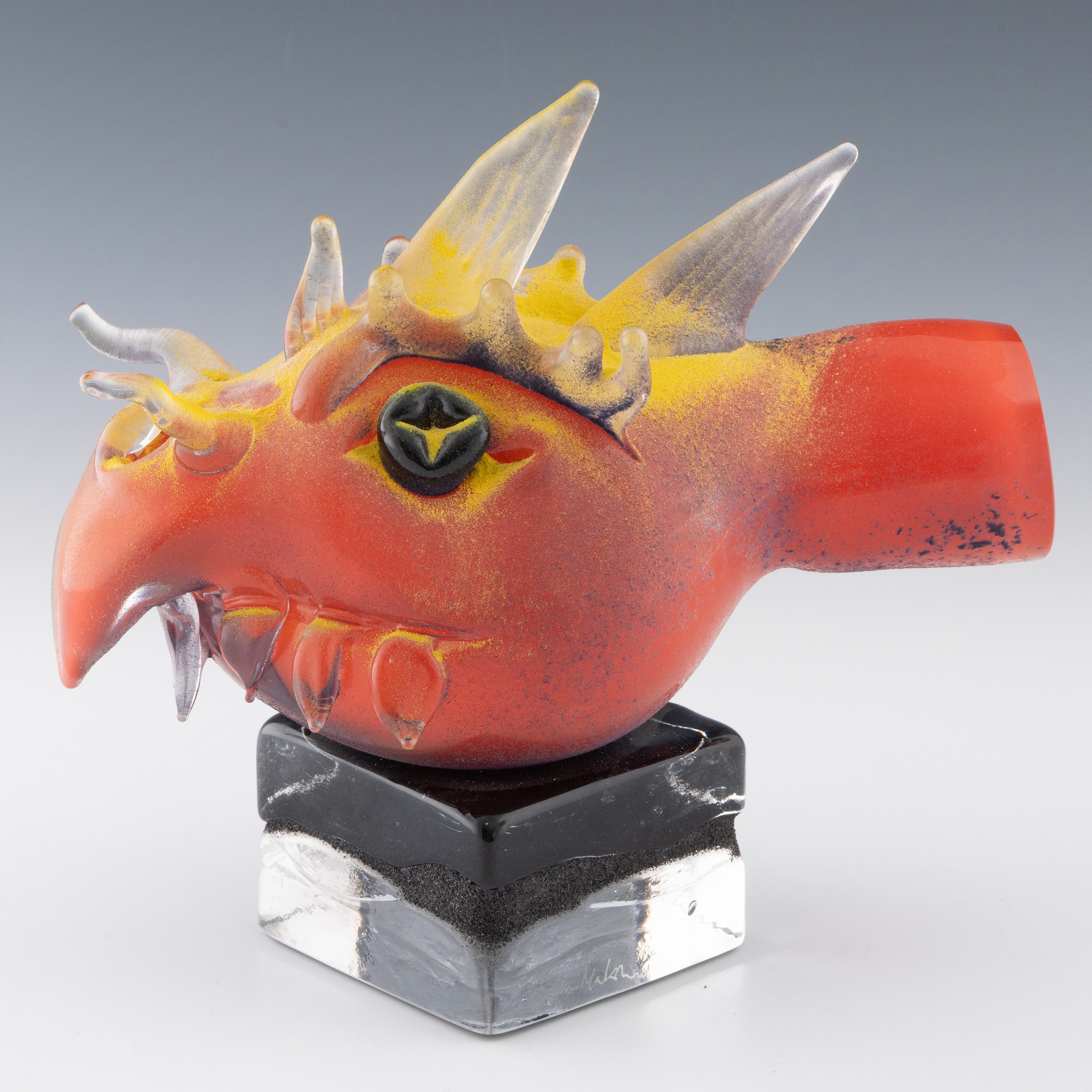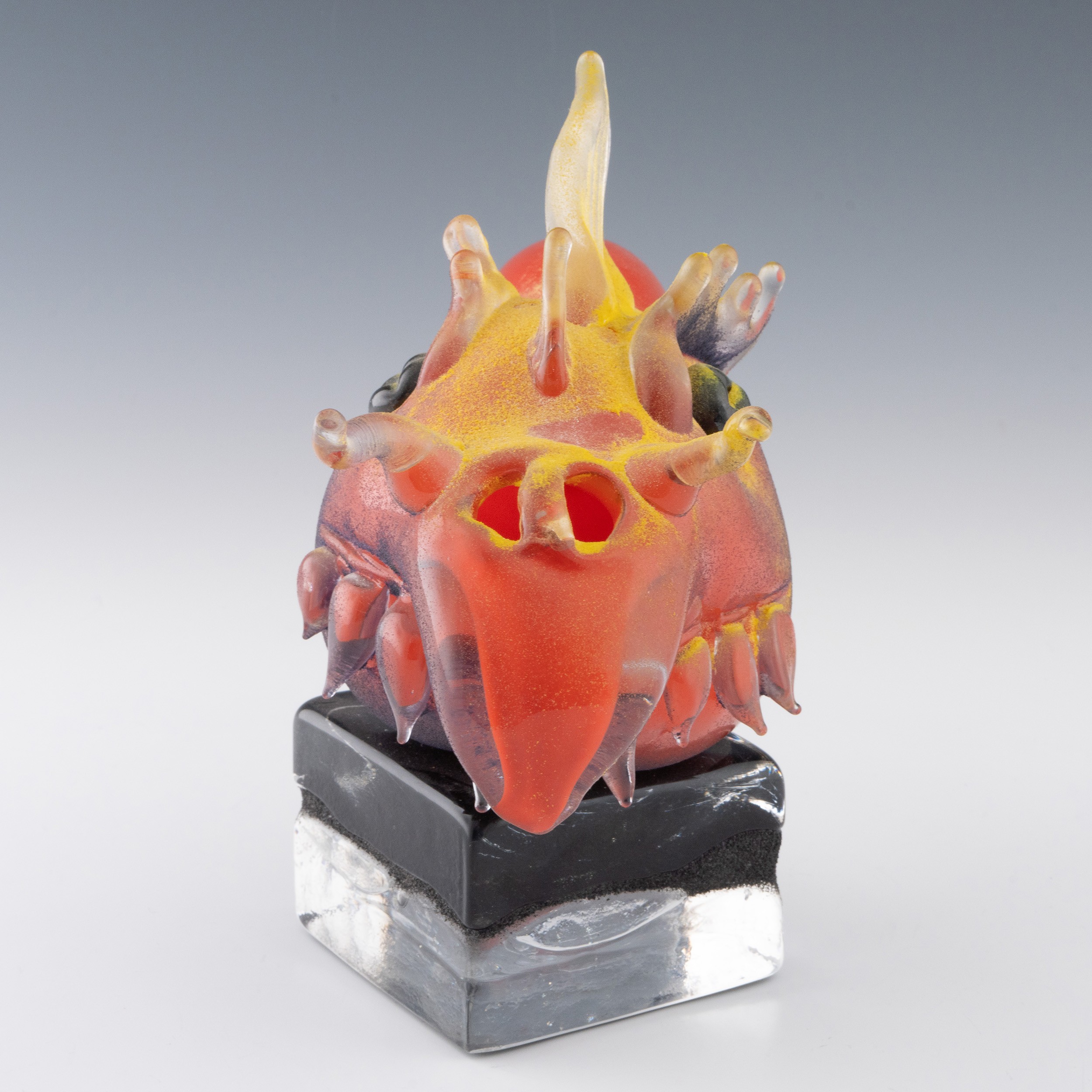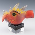 A unique Allister Malcolm studio glass 'Dragon's Head' bedside lamp, made in 2021, hotworked in red glass, with black applied eyes, and applied colourless teeth, eyebrows, and horns, dusted with matte yellow powdered glass, the neck with hole to insert the bulb to illuminate, mounted on a cast base wished 'Allister Malcolm', 24cm long, 21.5cm high. (PJS066)