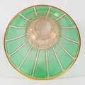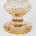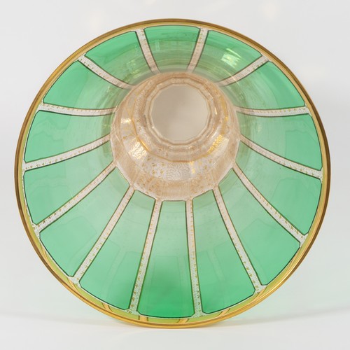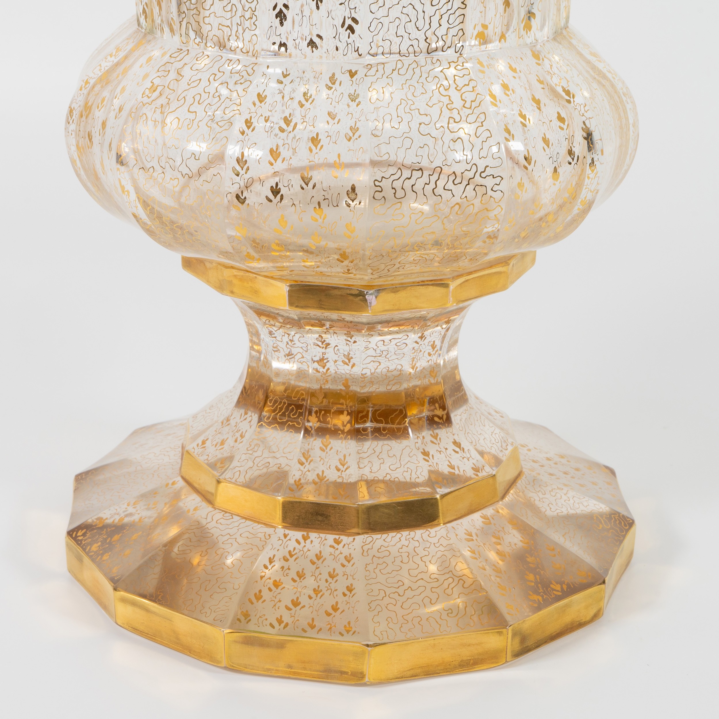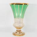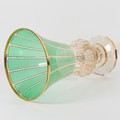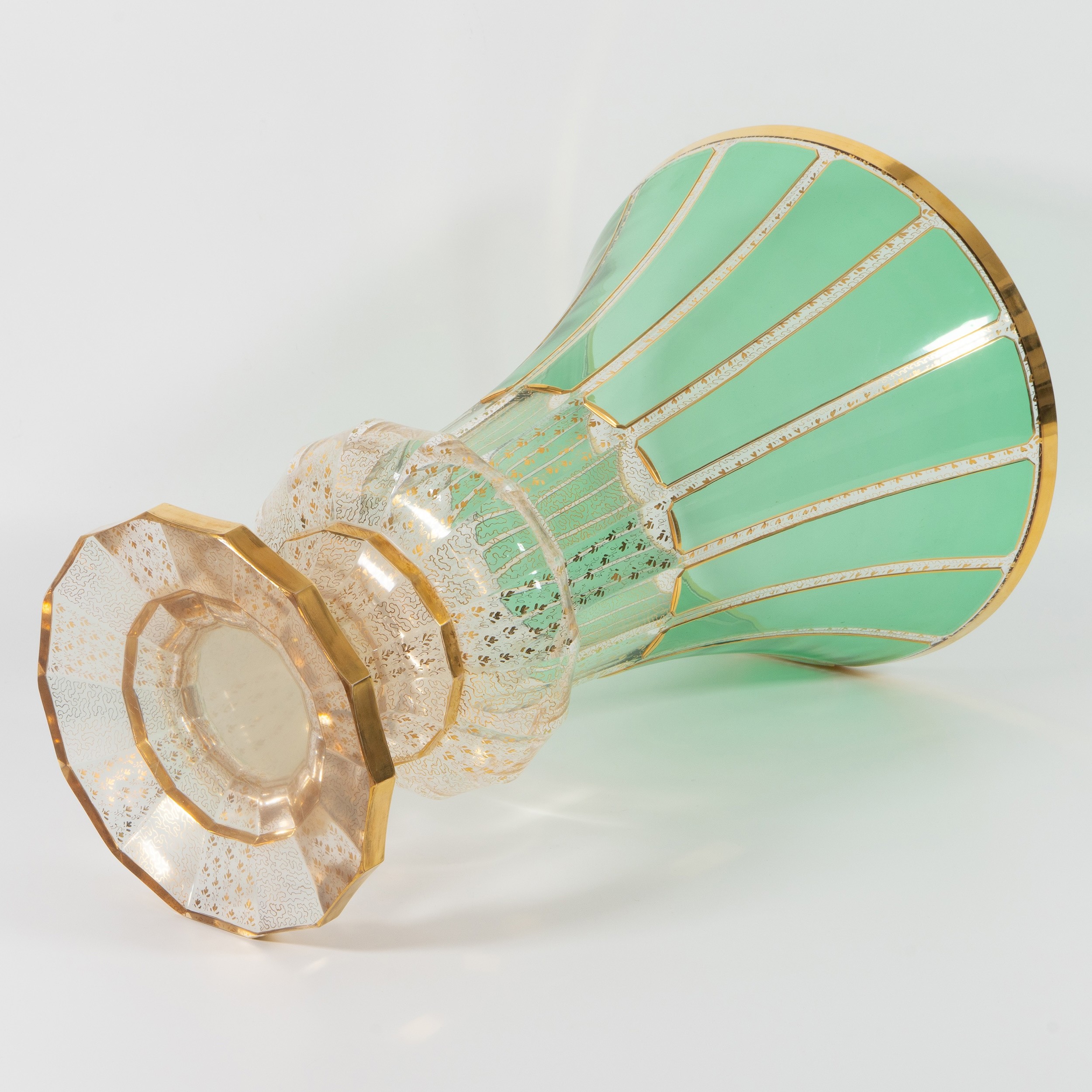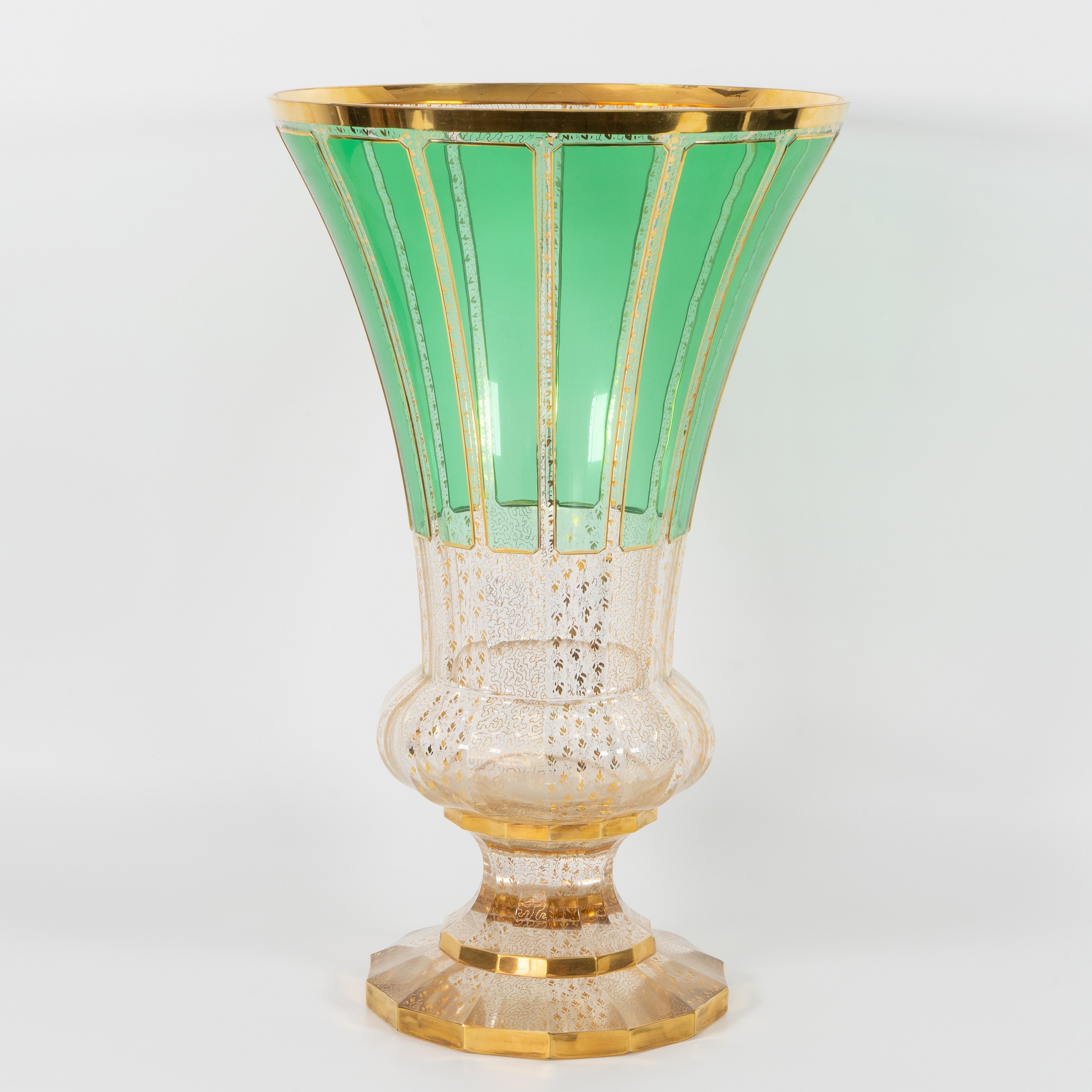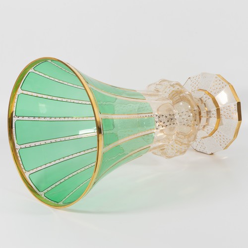 An early to mid 20thC oversized Bohemian display goblet or vase, possibly by Moser or Harrach, with flared trumpet bowl with 14 green flashed low relief panels, over a 14-sided faceted knop, stem and foot, with alternating panels of gilded foliate and vermiculated designs, with gilt banding to the rim, foot and knop edges, 49.5cm high, 30.5cm at widest diameter.