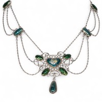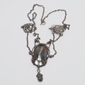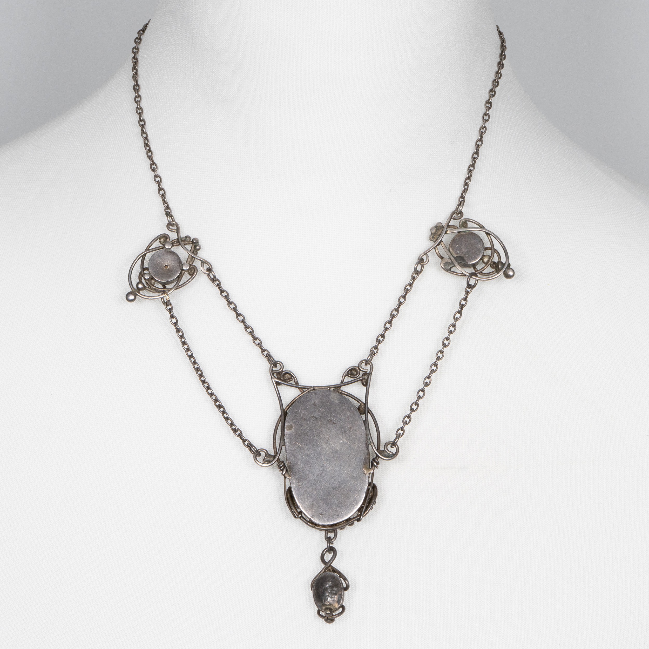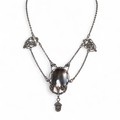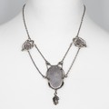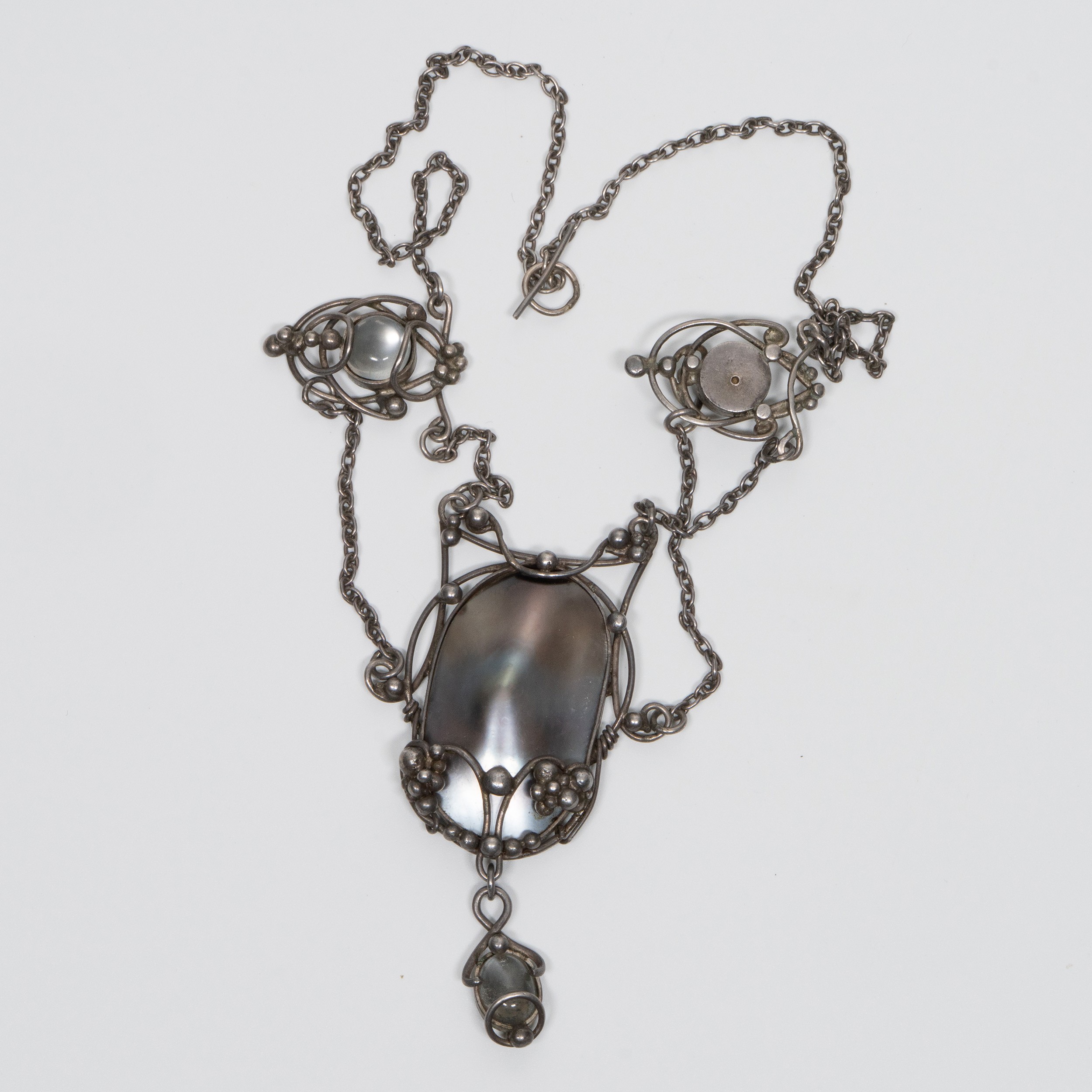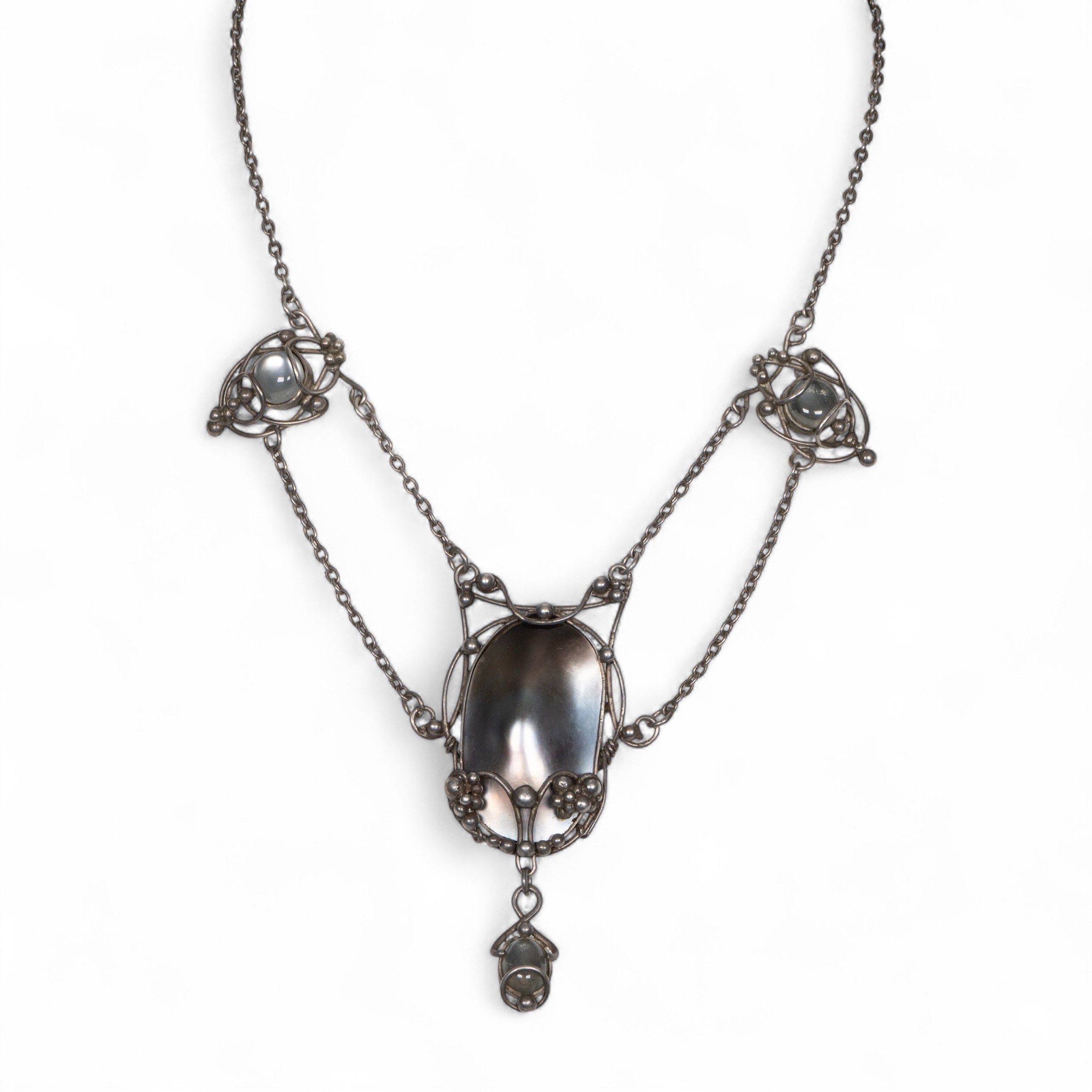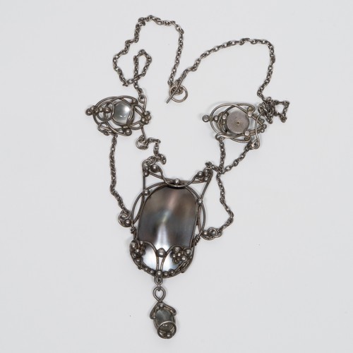 An early 20thC Arts & Crafts silver and mother of pearl moonstone pendant necklace, with two openwork suspenders decorated with a beaded fruit design and mother of pearl cabochons, pendant with an openwork berry design together with moonstone drop, unmarked though almost certainly English, 42cm total chain length, 7cm pendant drop, 4.3cm width, 30g total weight. (LDC14709)