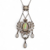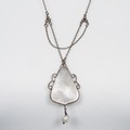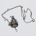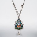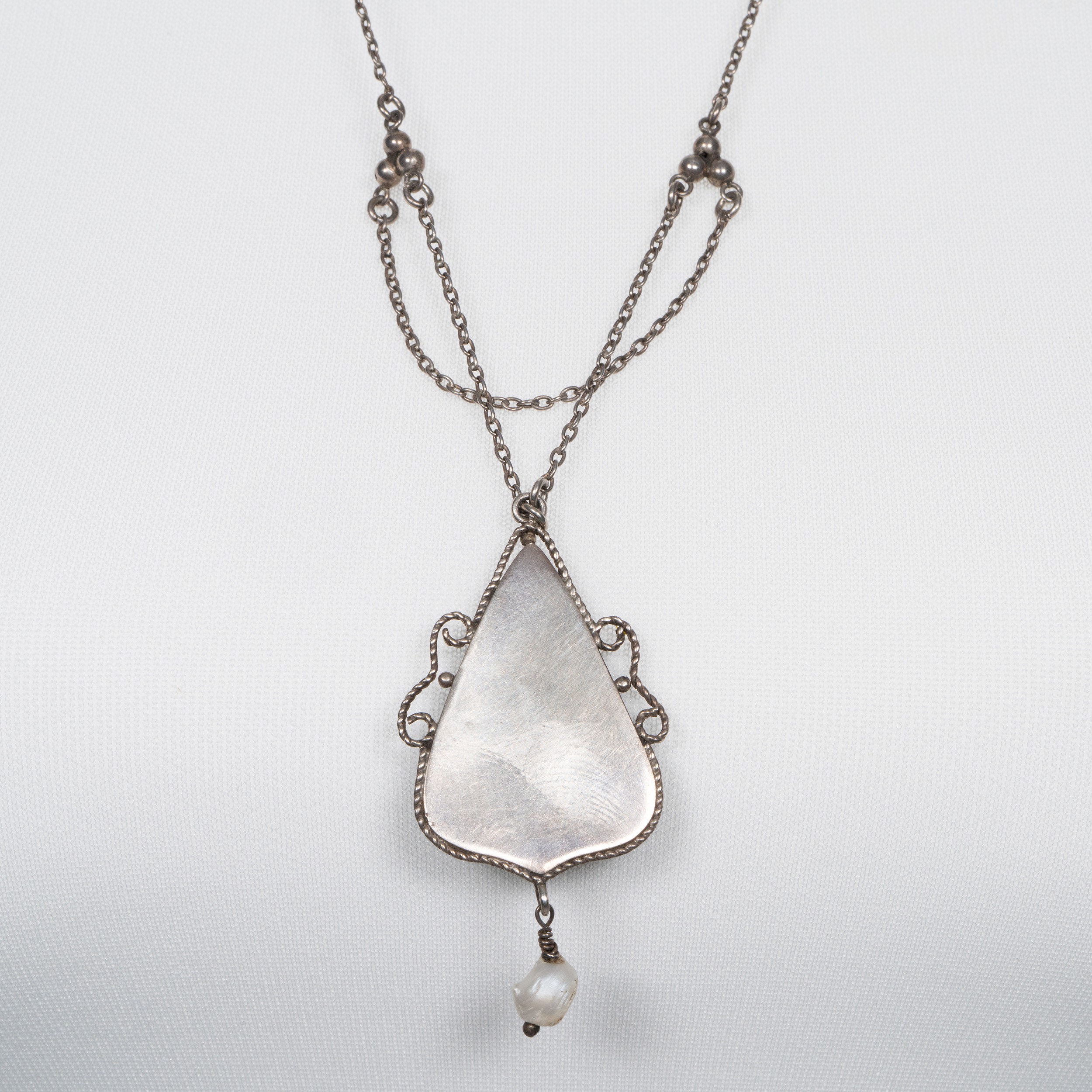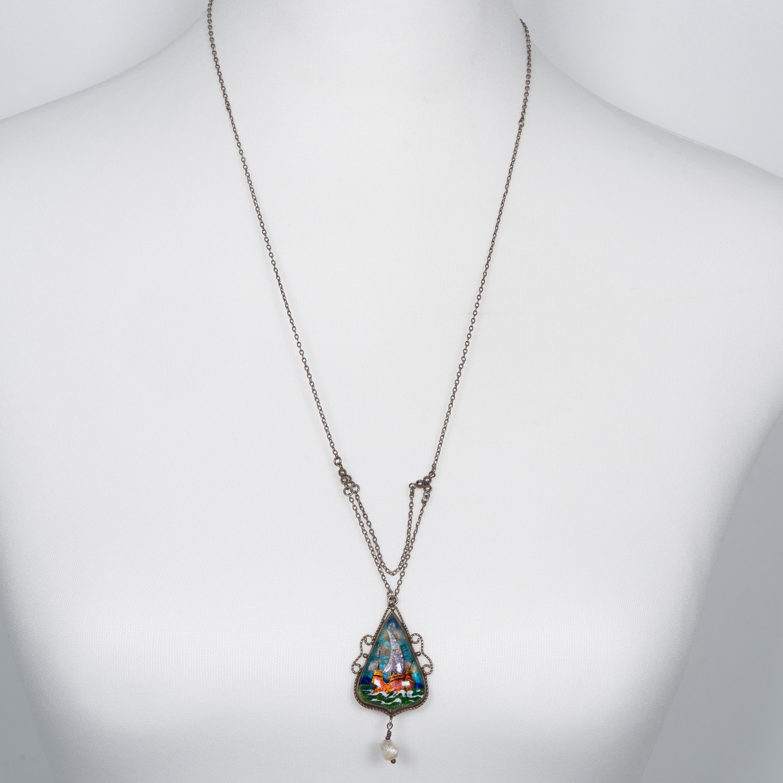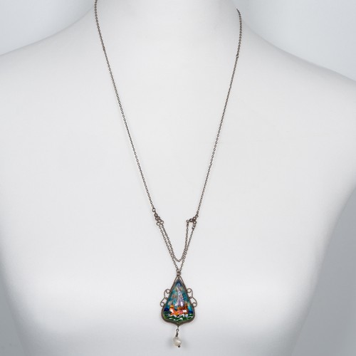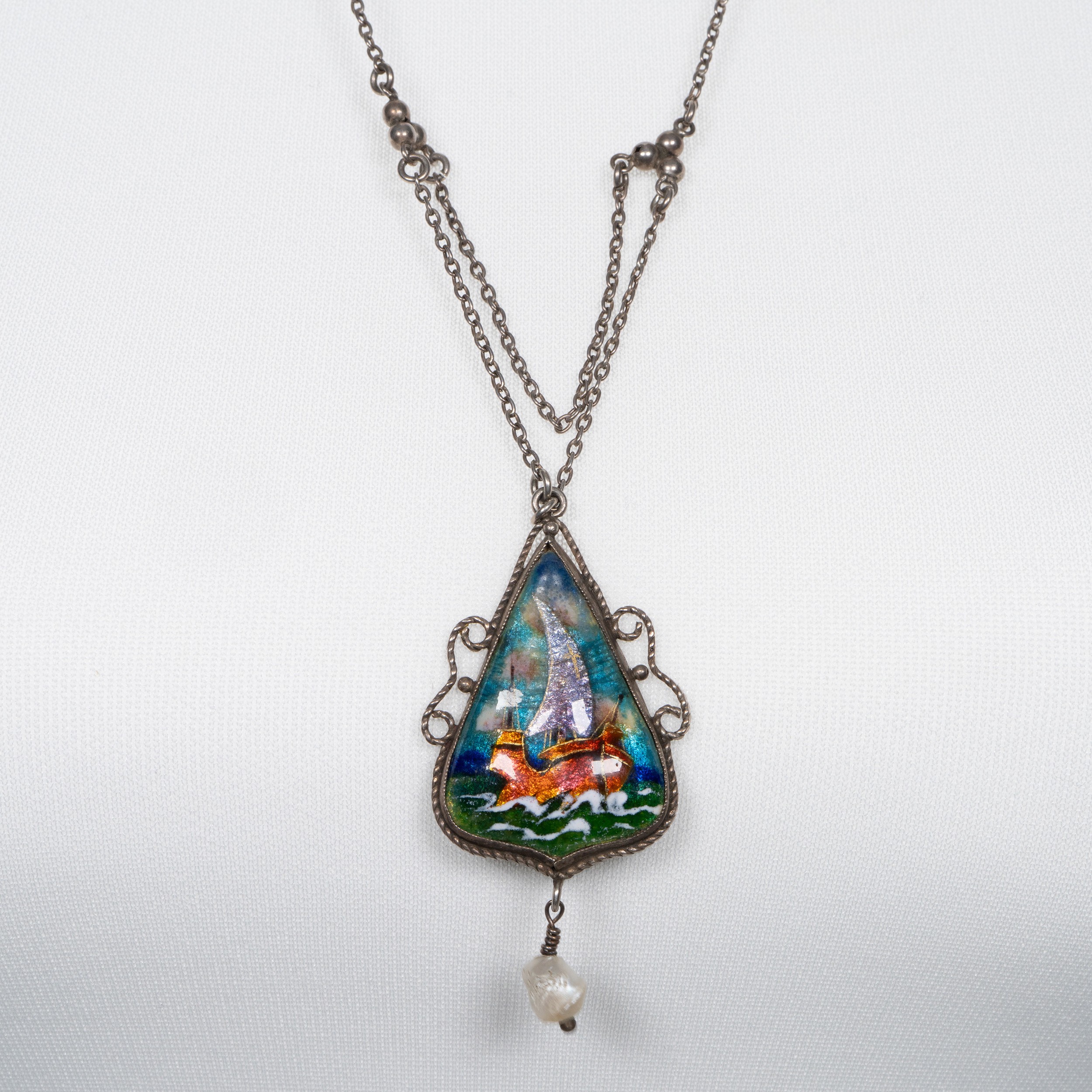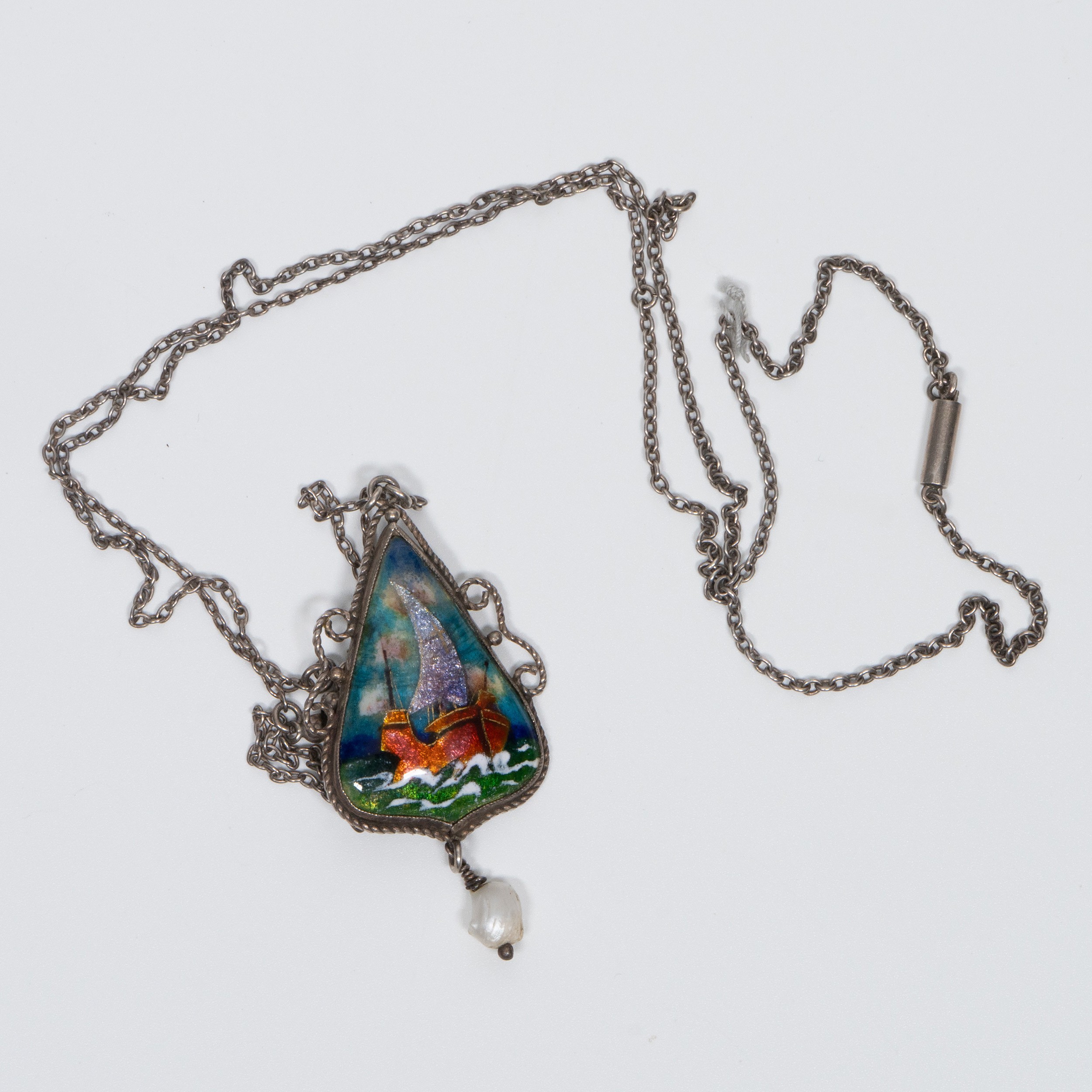 An early 20thC Arts & Crafts silver and enamel pendant necklace, decorated with an iridescent enamelled plaque depicting a galleon under sail at sea, together with a baroque pearl drop suspended from silver ball clusters, unmarked though almost certainly English, 64cm total chain length, 5.5cm height, 2.5cm width, 12g total weight. (LDC12760)