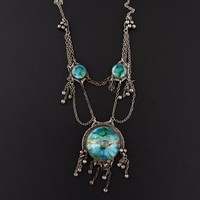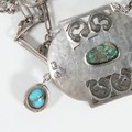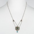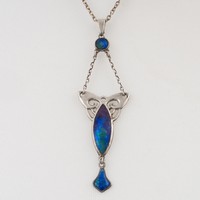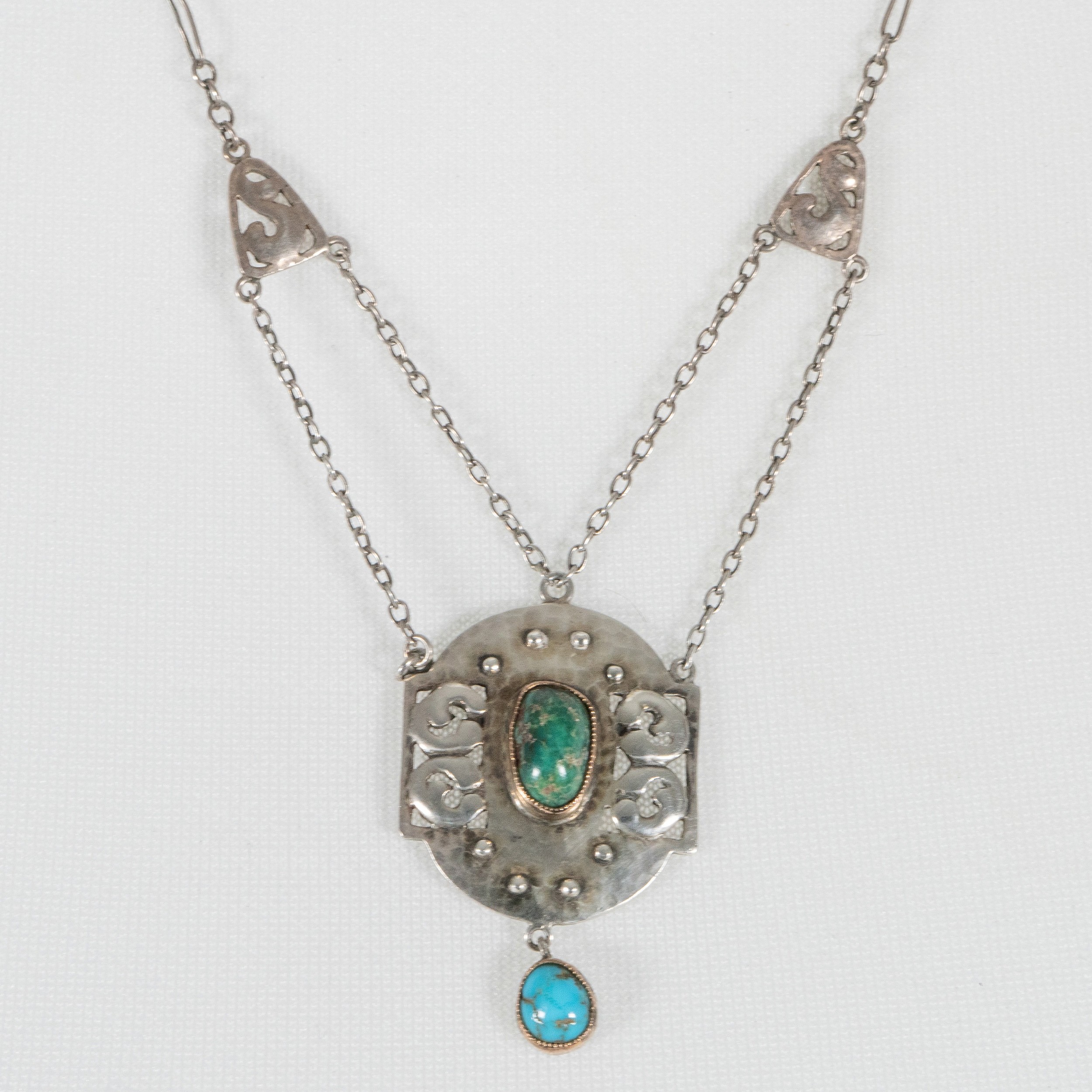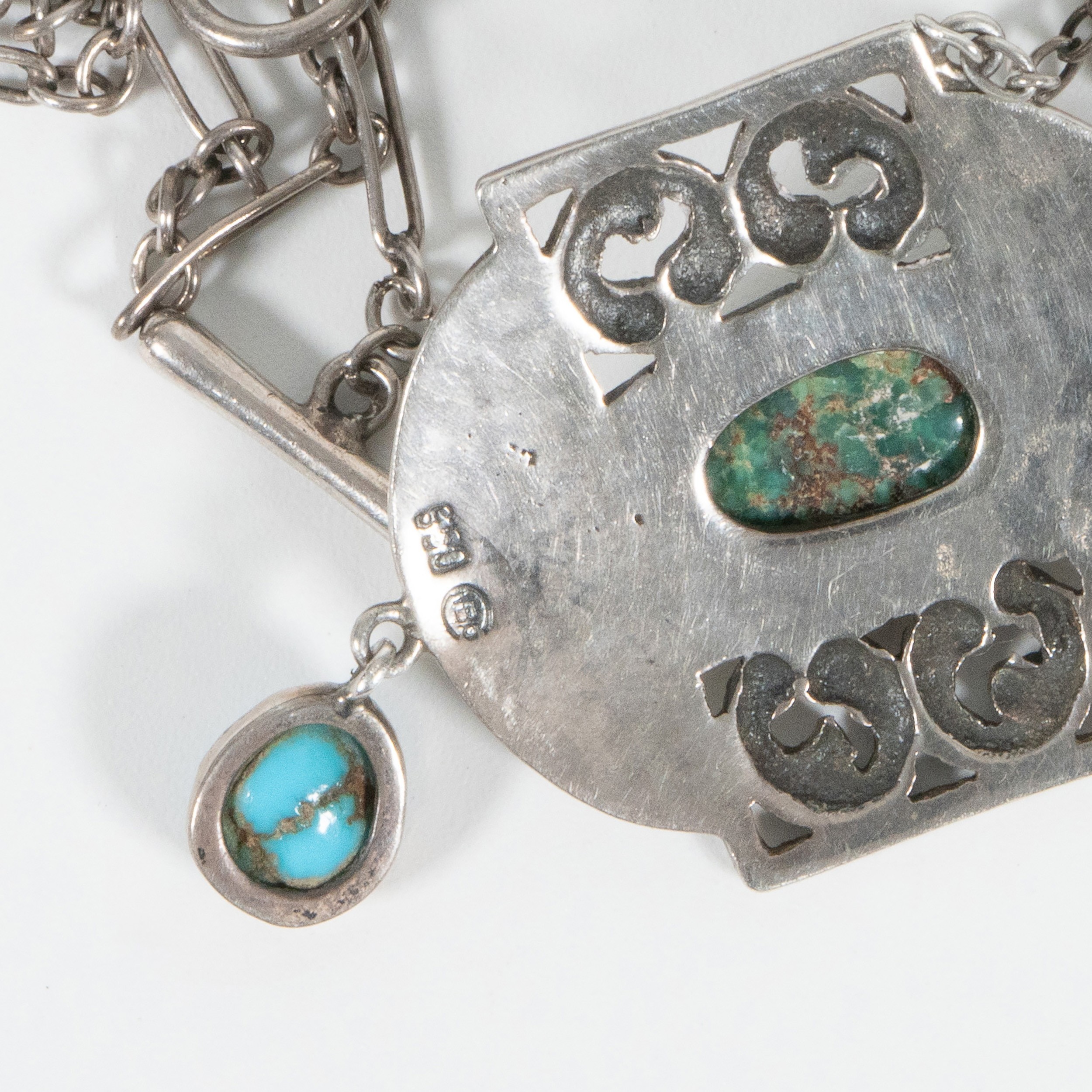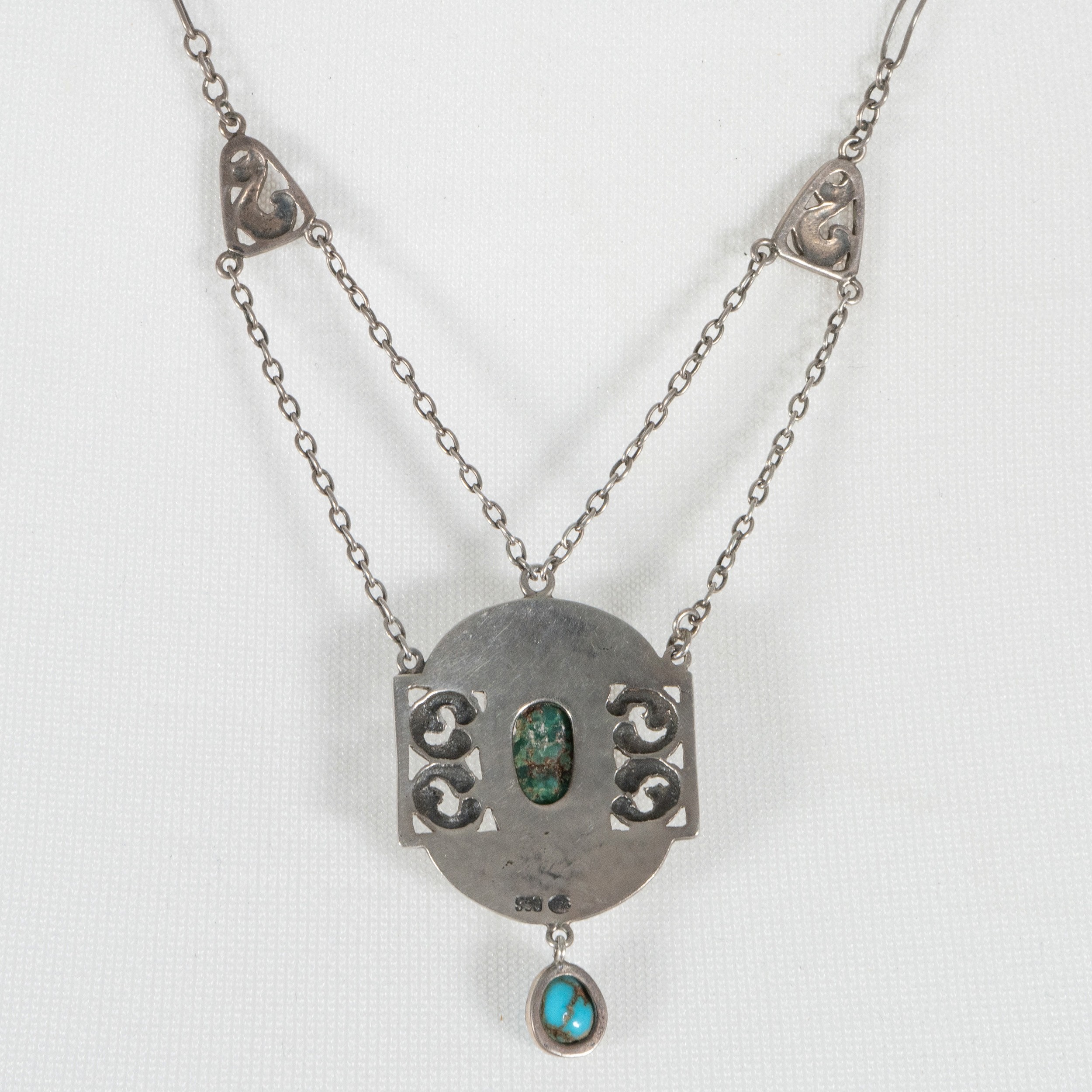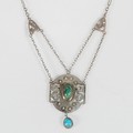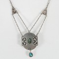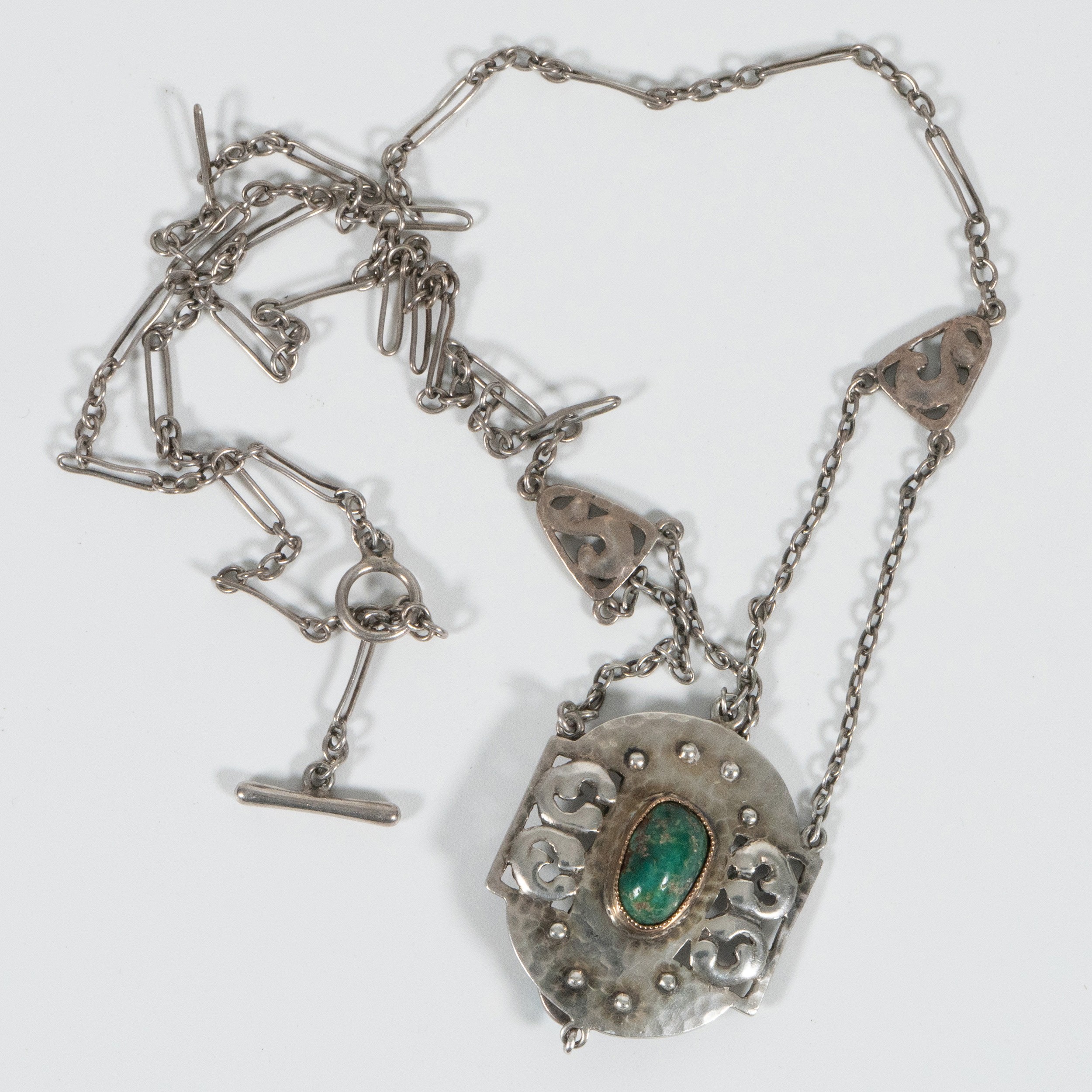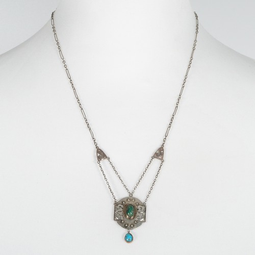 An Arts & Crafts Murrle Bennet & Co white metal pendant necklace, centre of pendant with green stone set in a gold mount with matrix drop also with gold mount, marked 'M.B. CO' and '950' to denote the silver content, together with its original white metal chain, 49cm total chain length, 4.5cm pendant drop, 9g total weight. (LDC16422)