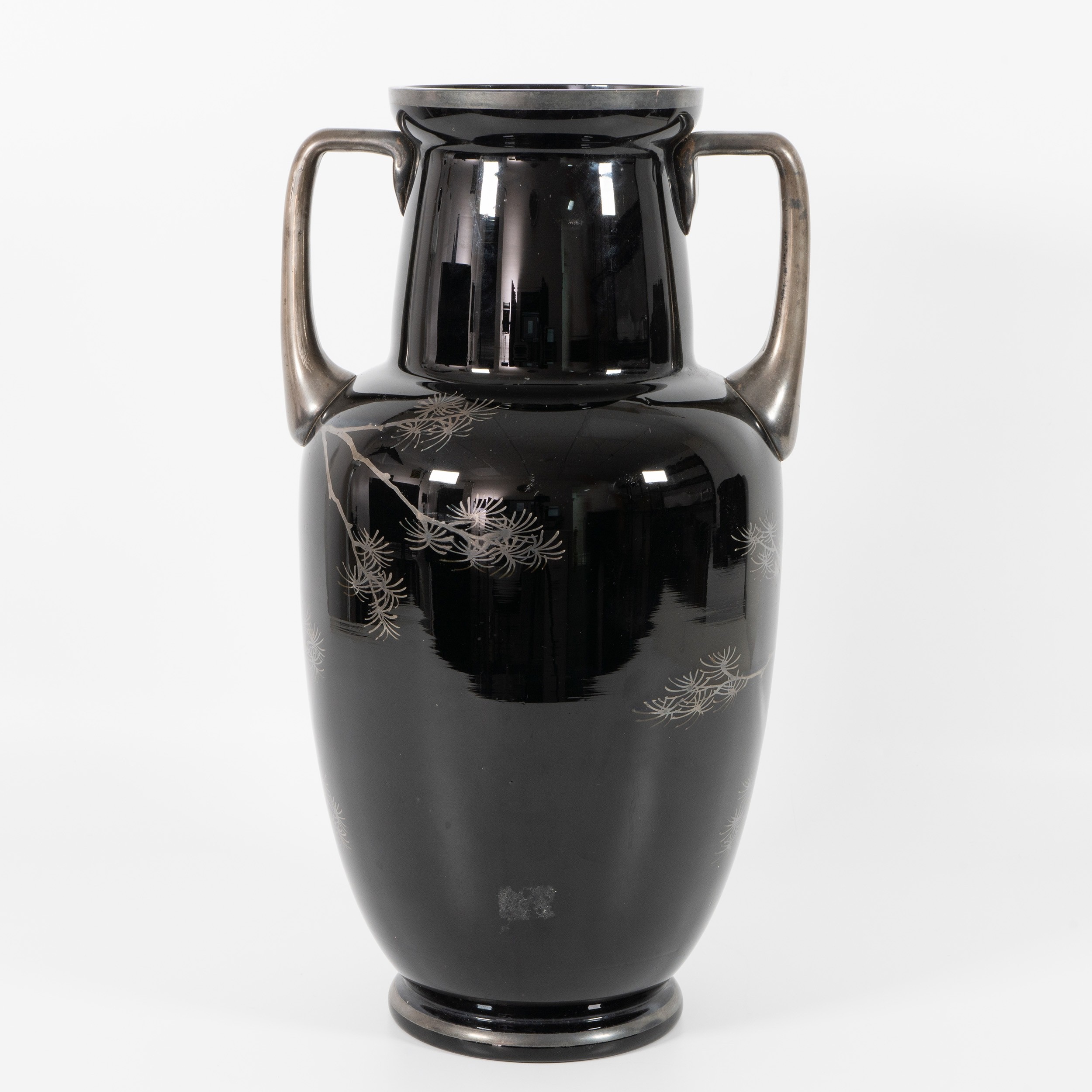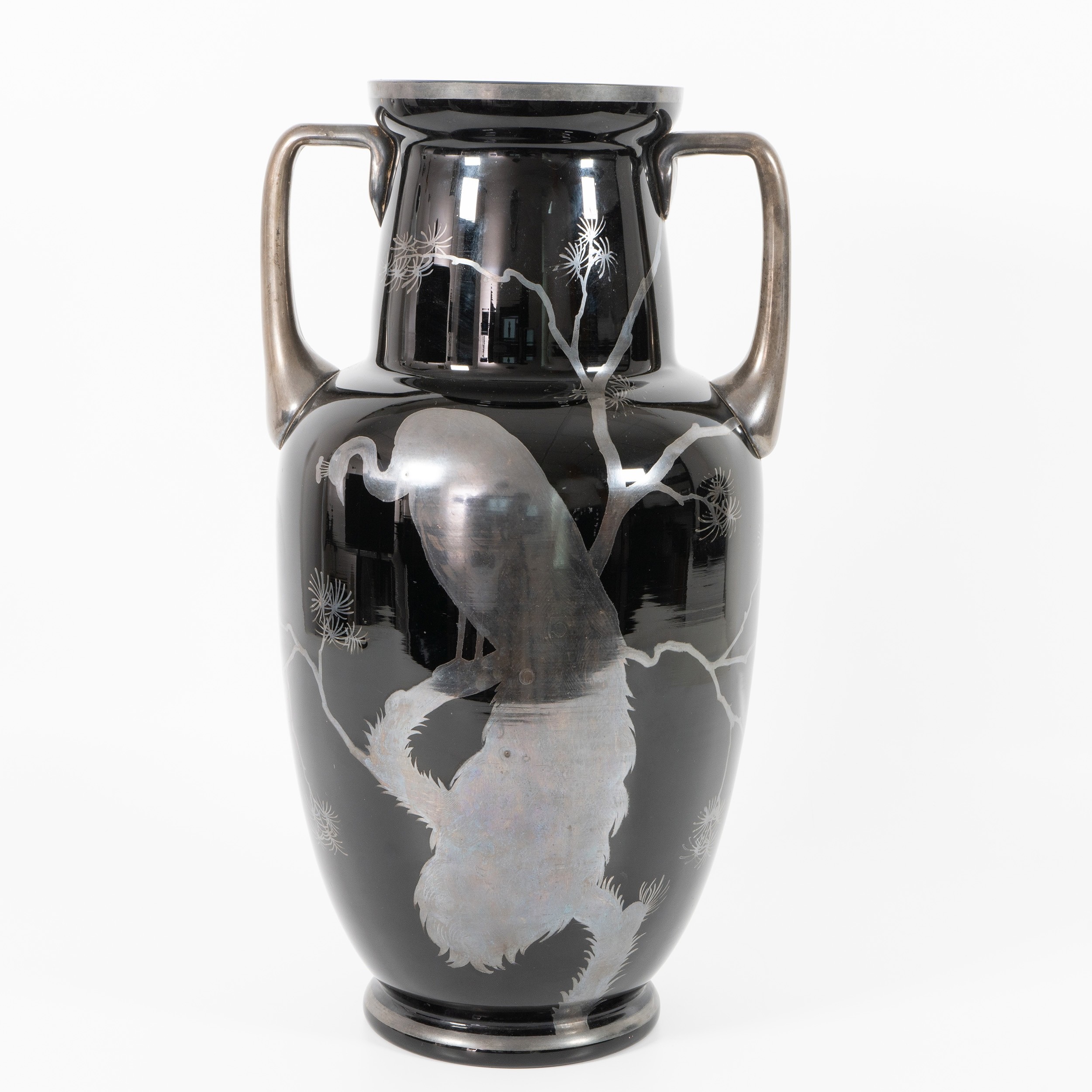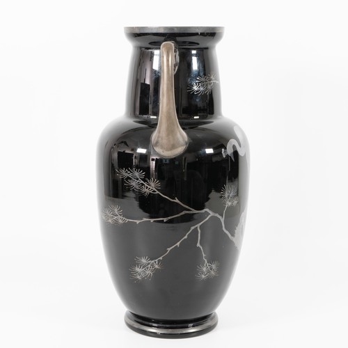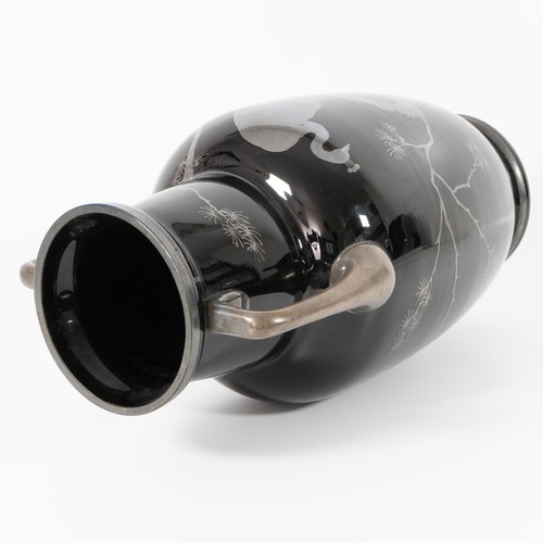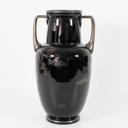A 1930s Czech black glass vase with silver overlay, decorated by Michael Herman, depicting a peacock perched on a fir tree, 39cm height.
