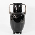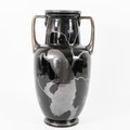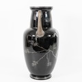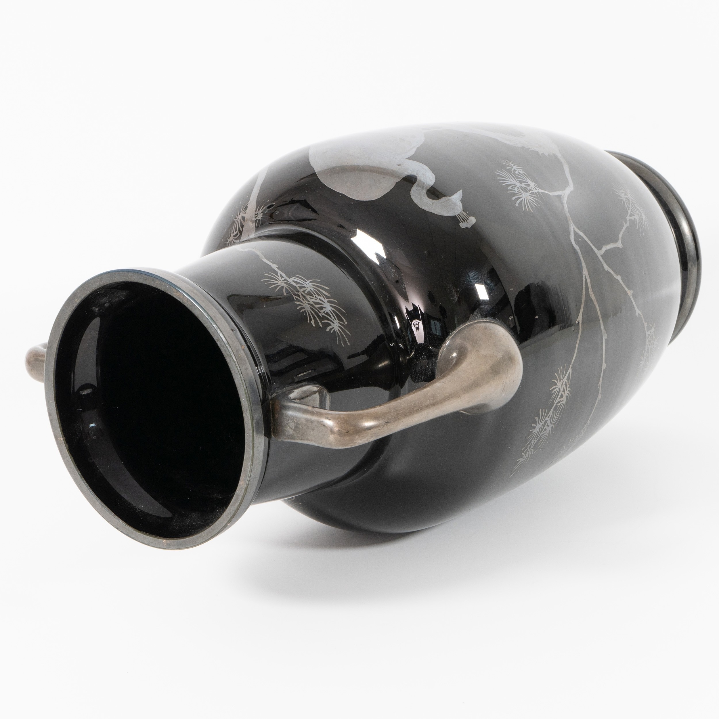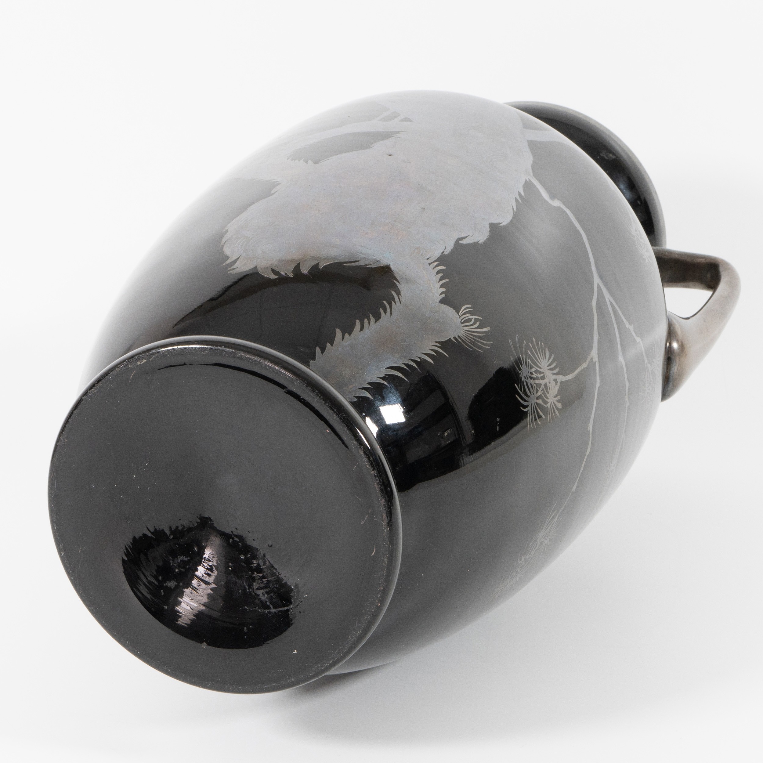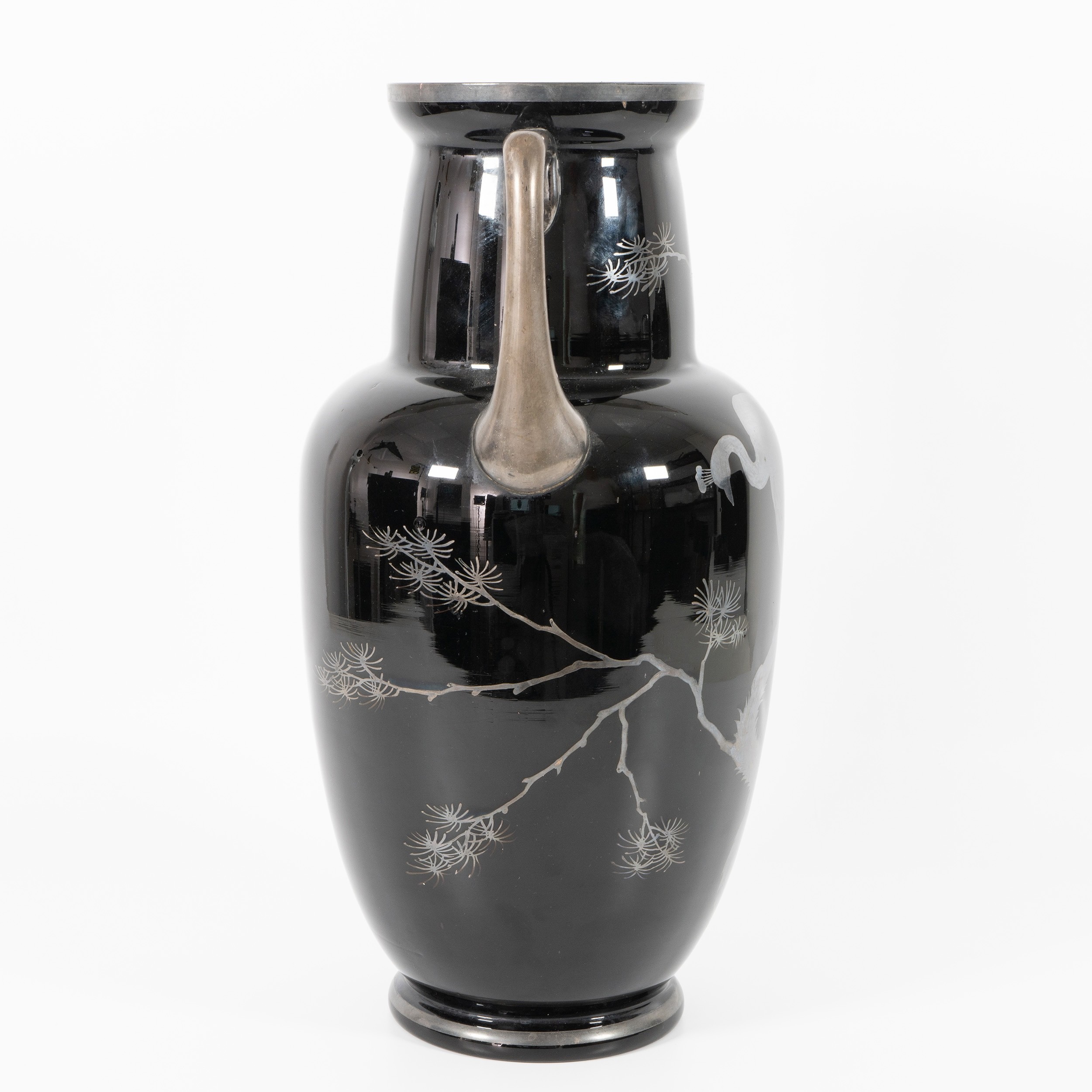 A 1930s Czech black glass vase with silver overlay, decorated by Michael Herman, depicting a peacock perched on a fir tree, 39cm height.