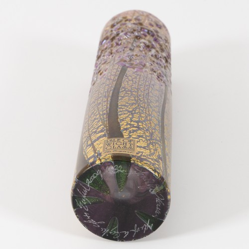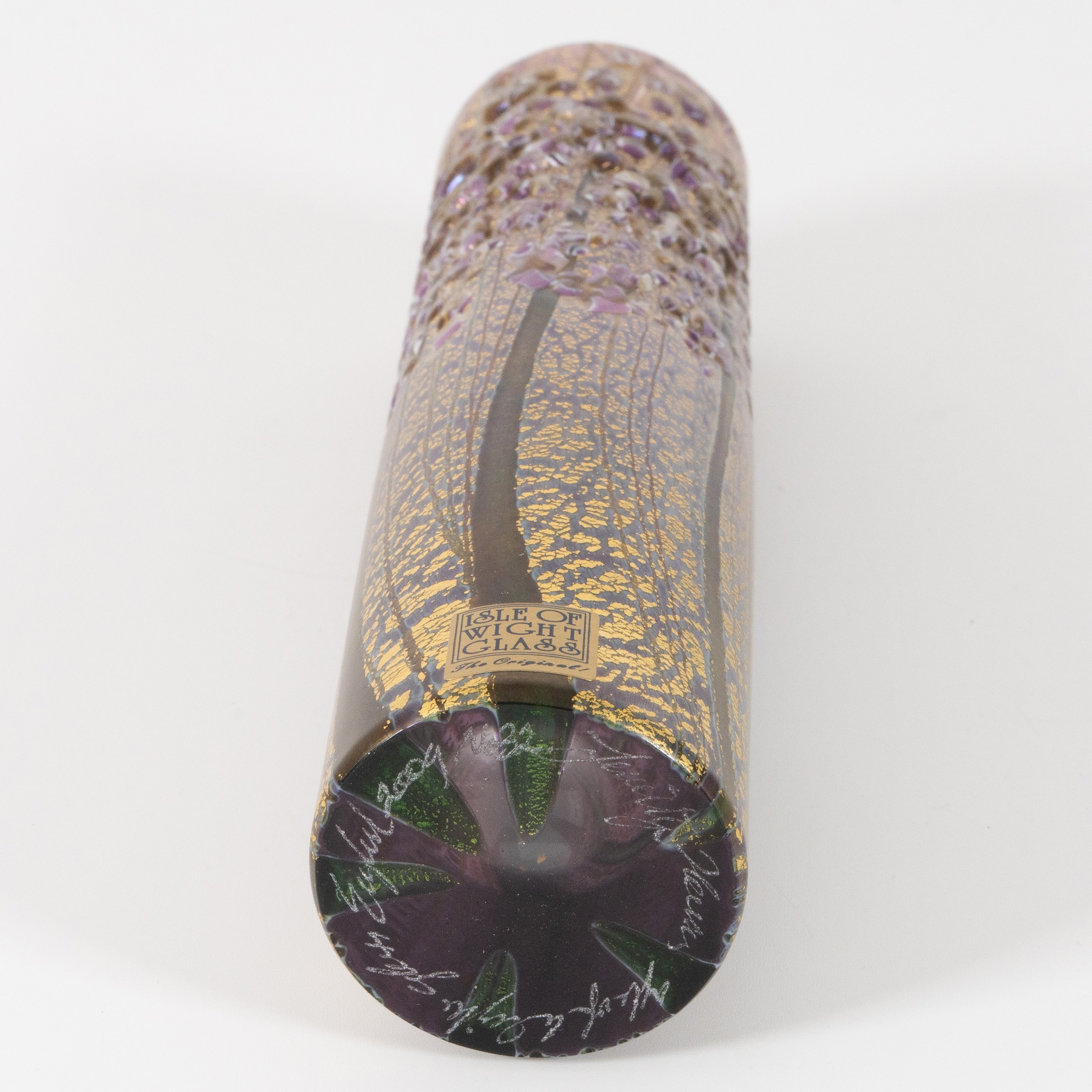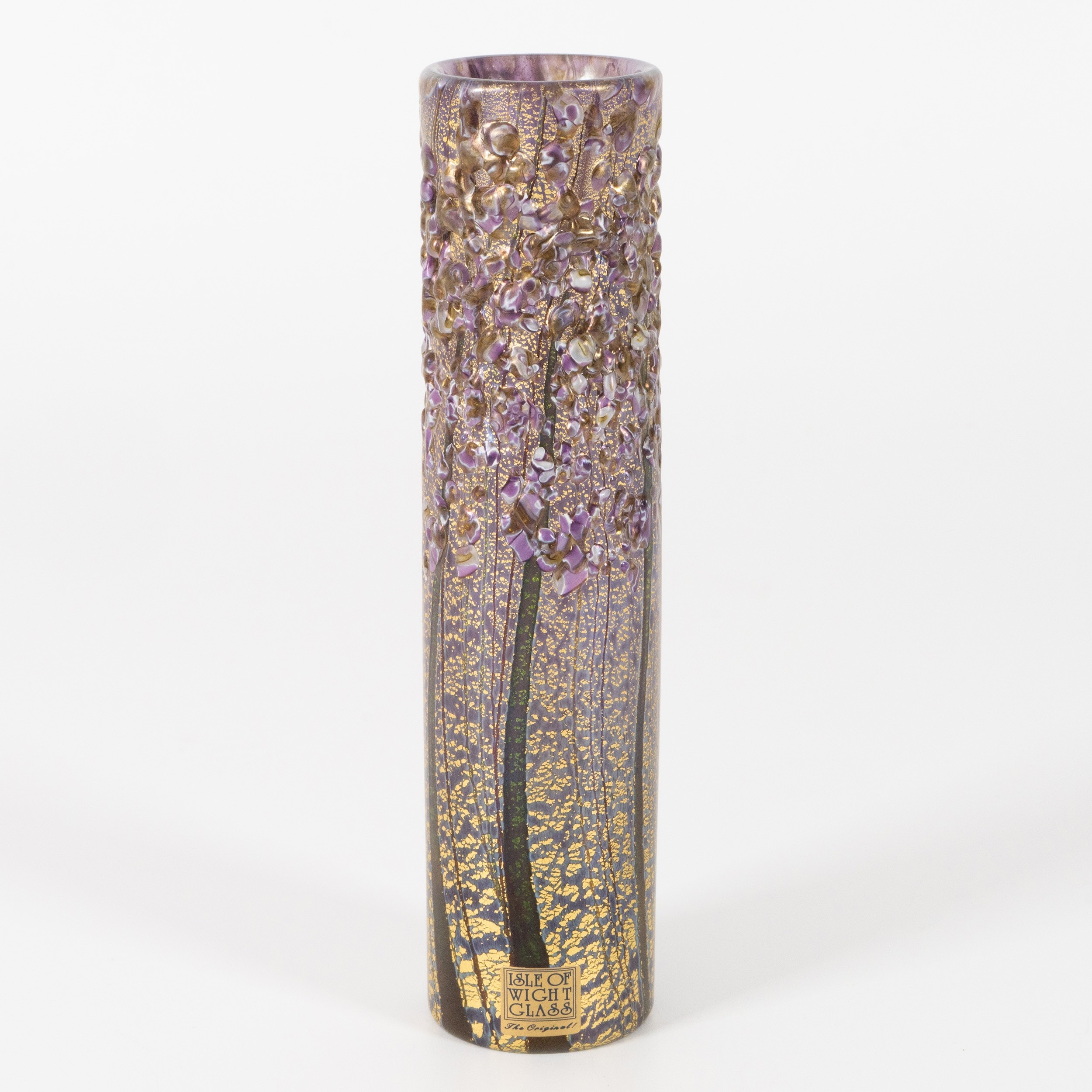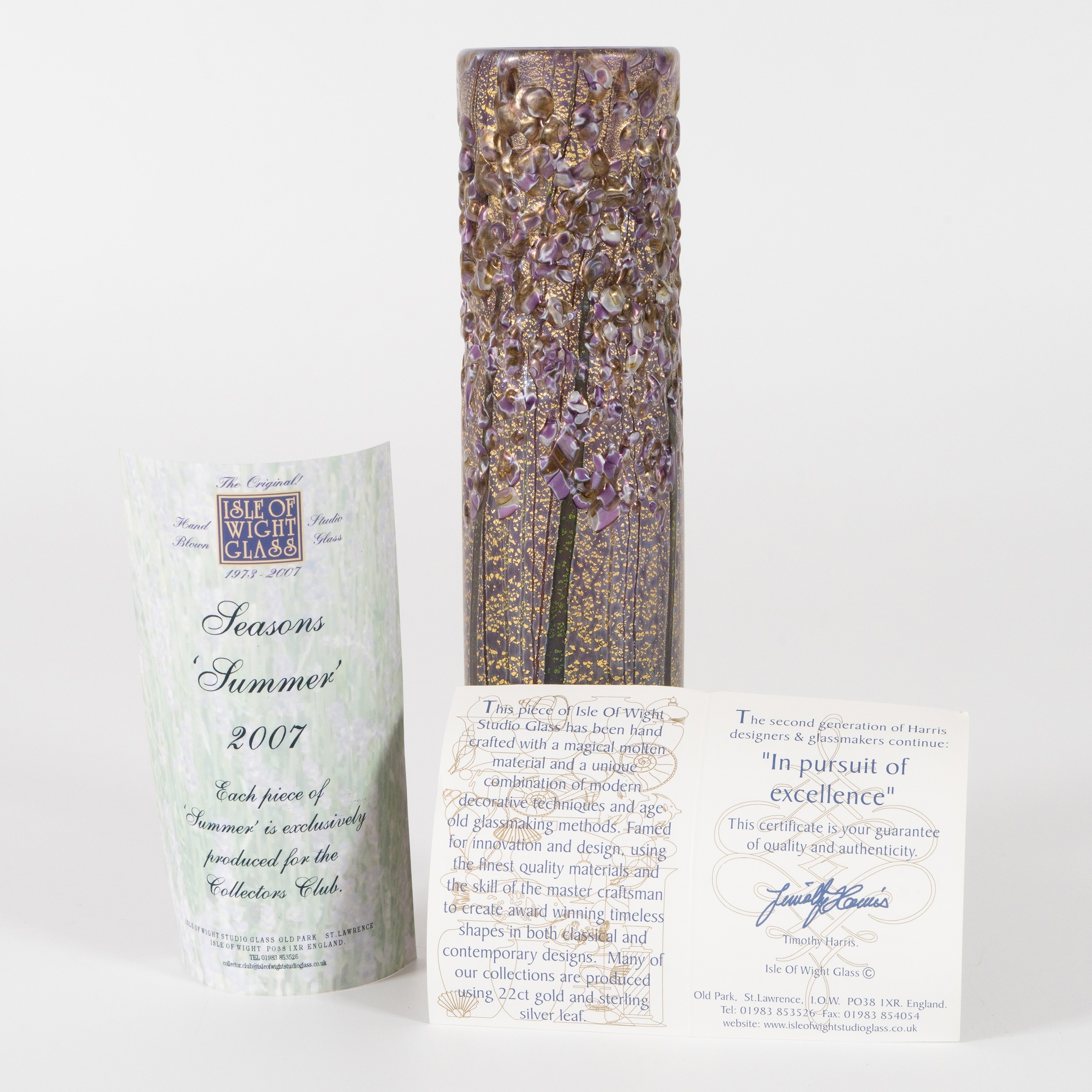 An Isle of Wight Studio Glass medium-sized 'Seasons - Summer' cylinder vase, designed and made by Timothy Harris, the base inscribed 'Isle of Wight Glass England 2009 No.32 Timothy Harris', together with a certificate of authenticity signed and numbered by Timothy Harris, an Isle of Wight Glass information tag, a company cylindrical box and packing, vase 16.4cm high, box 20.5cm high.