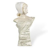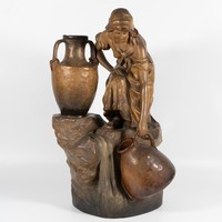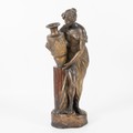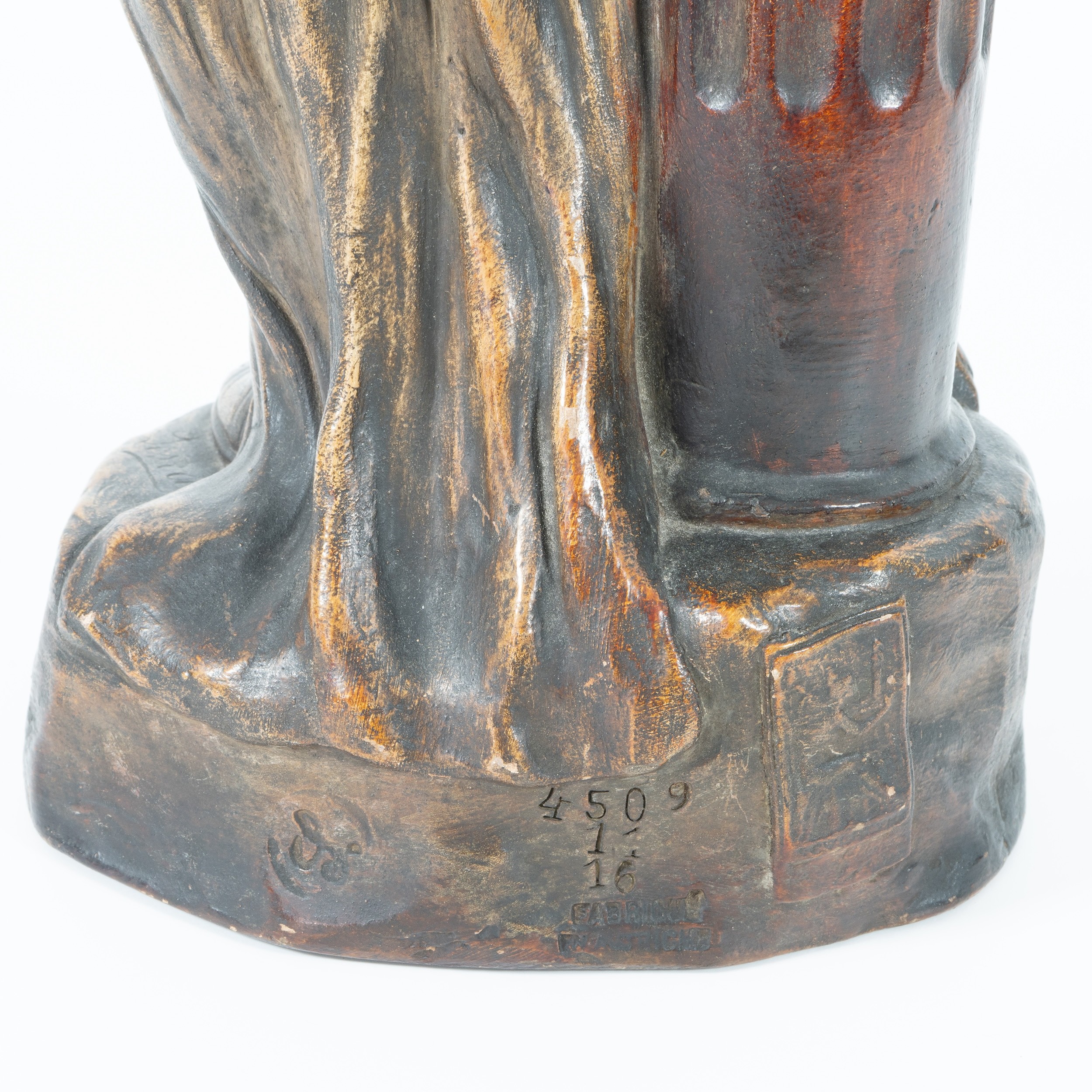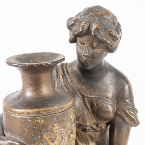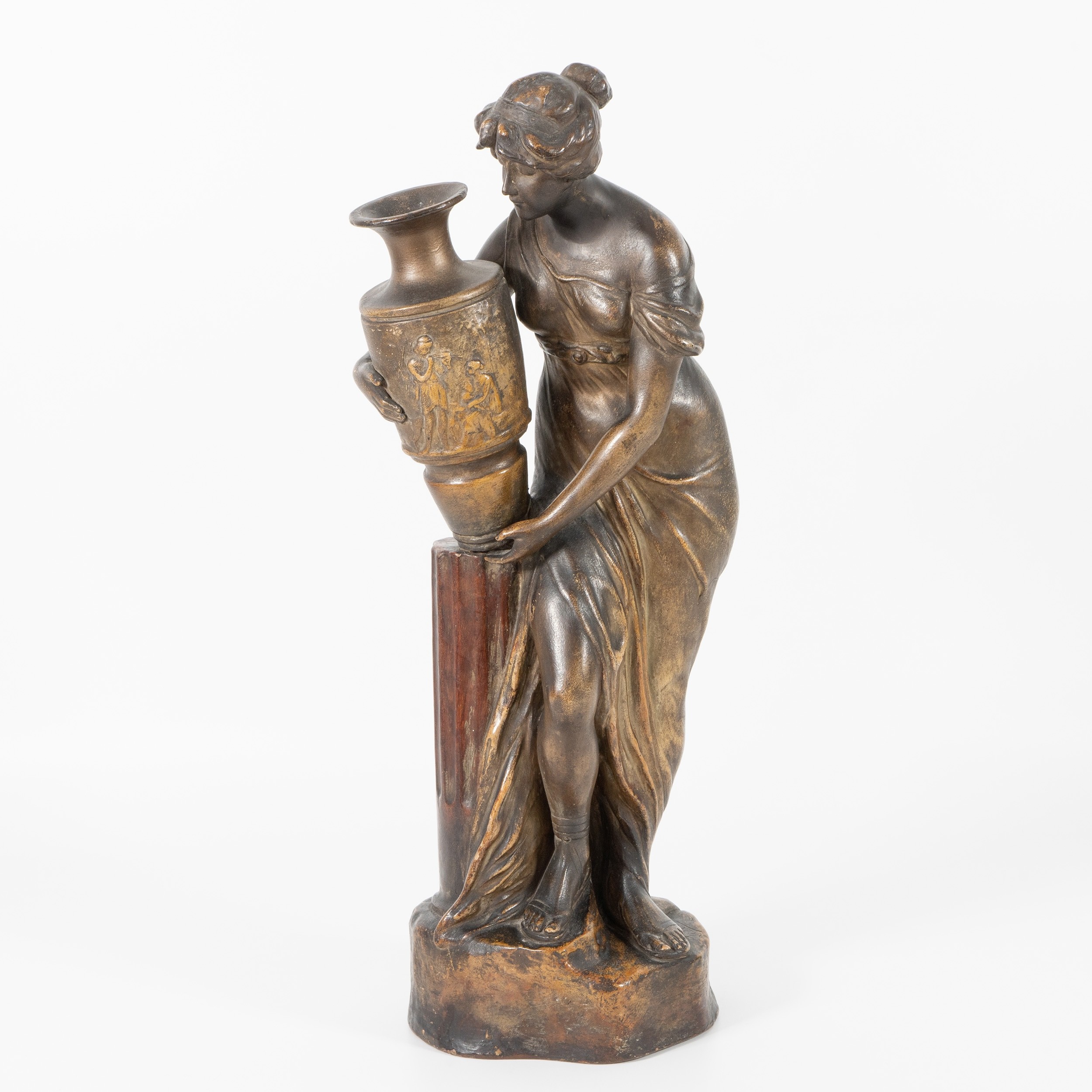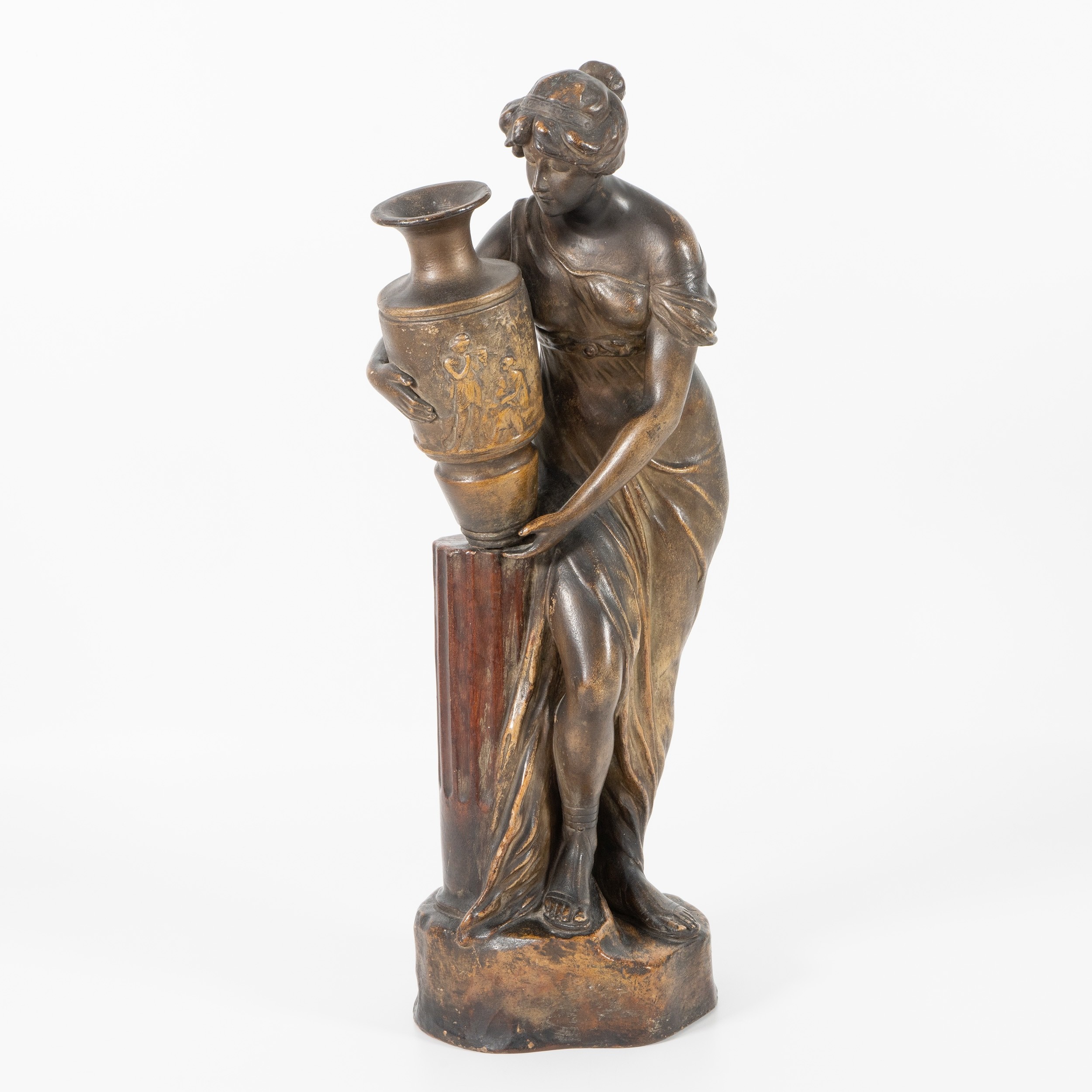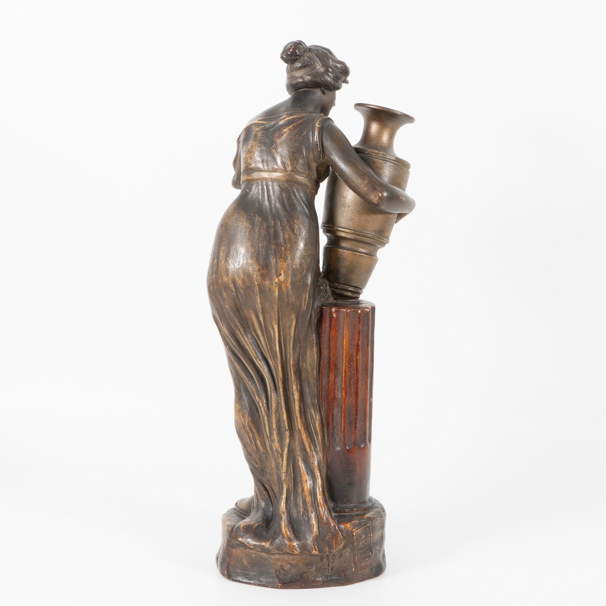 An early 20thC Austrian Art Nouveau Goldsheider 'Jessica' painted terracotta sculpture, modelled as a classically attired lady holding an amphora with high relief decoration supported on a pillar, with Goldsheider plaque and model number '4509', with incised 'GS' signature 'FABRIQUE EN AUTRICHE' and 'JESSICA' on the plinth, 47.5cm tall. (LDC12150)