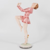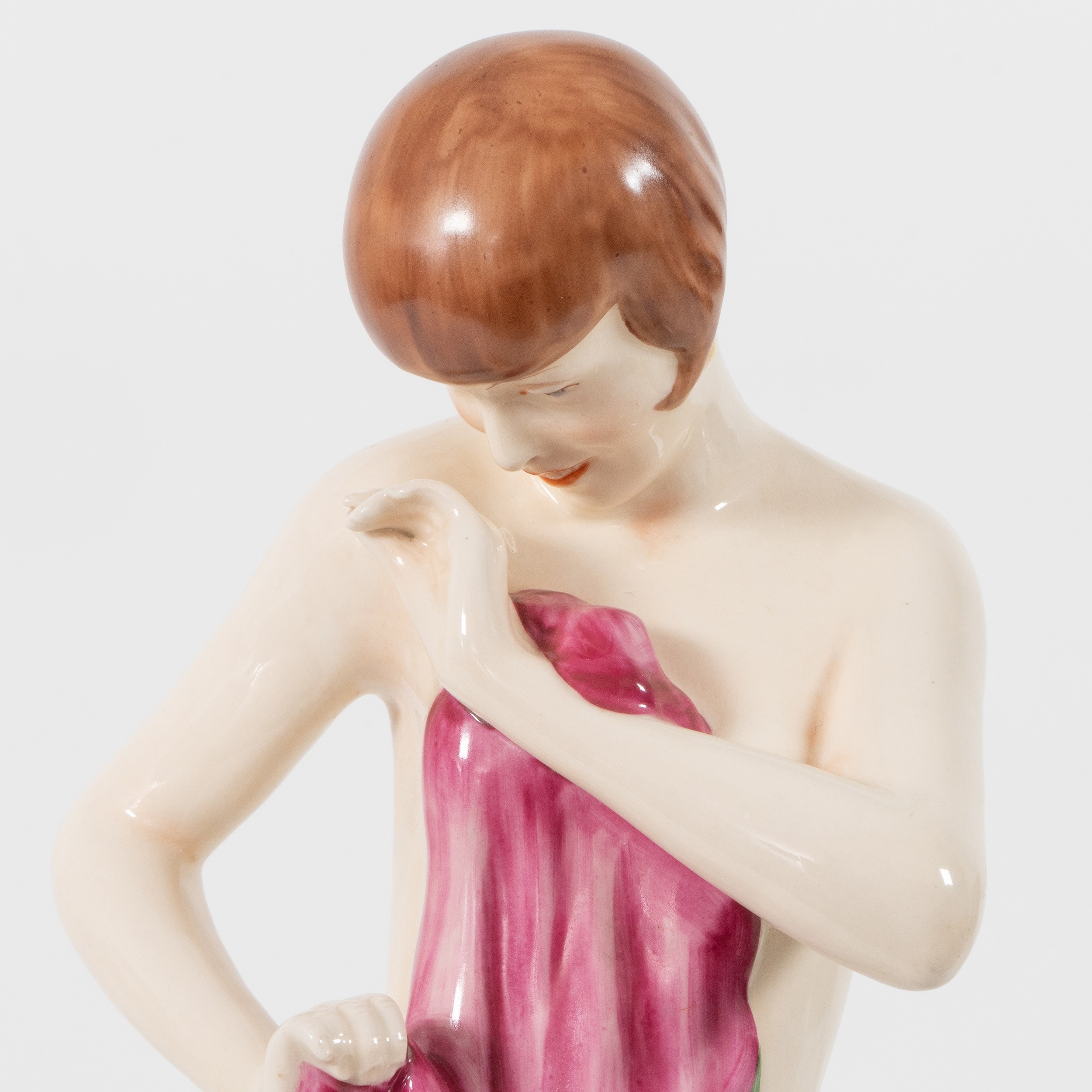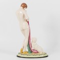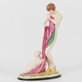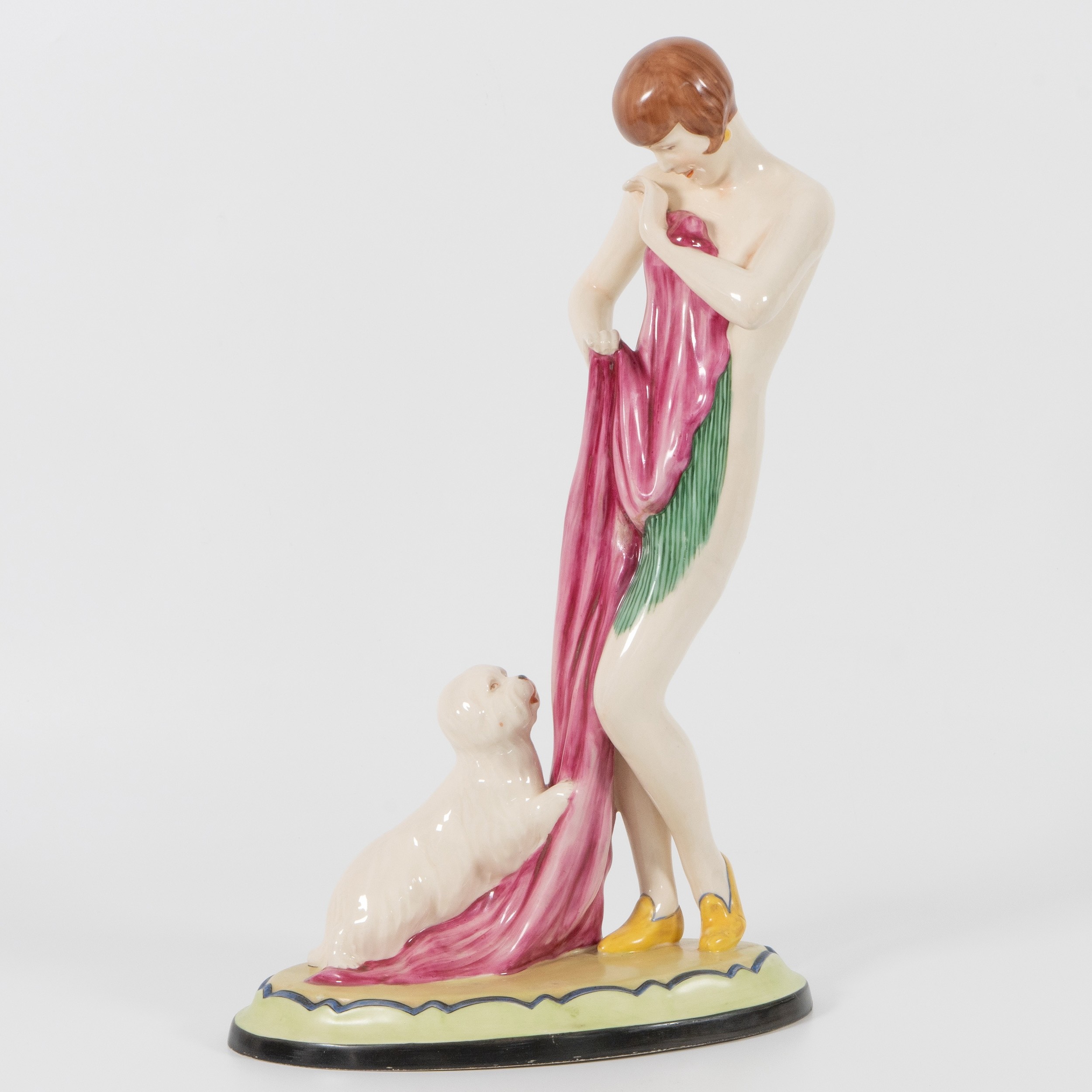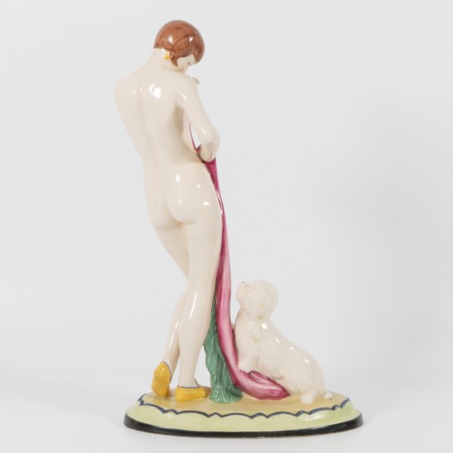 A 1930s Czech Art Deco Royal Dux ceramic figurine of a svelte naked lady with fashionably bobbed hair holding a pink towel with green fringe to cover her modesty, while a white Scottie dog jumps up and paws at the towel, the oval green, blue and yellow glazed base with applied dark pink triangle impressed 'ROYAL DUX BOHEMIA E' and further stamped '3080 4', 36cm high. (LC11814)